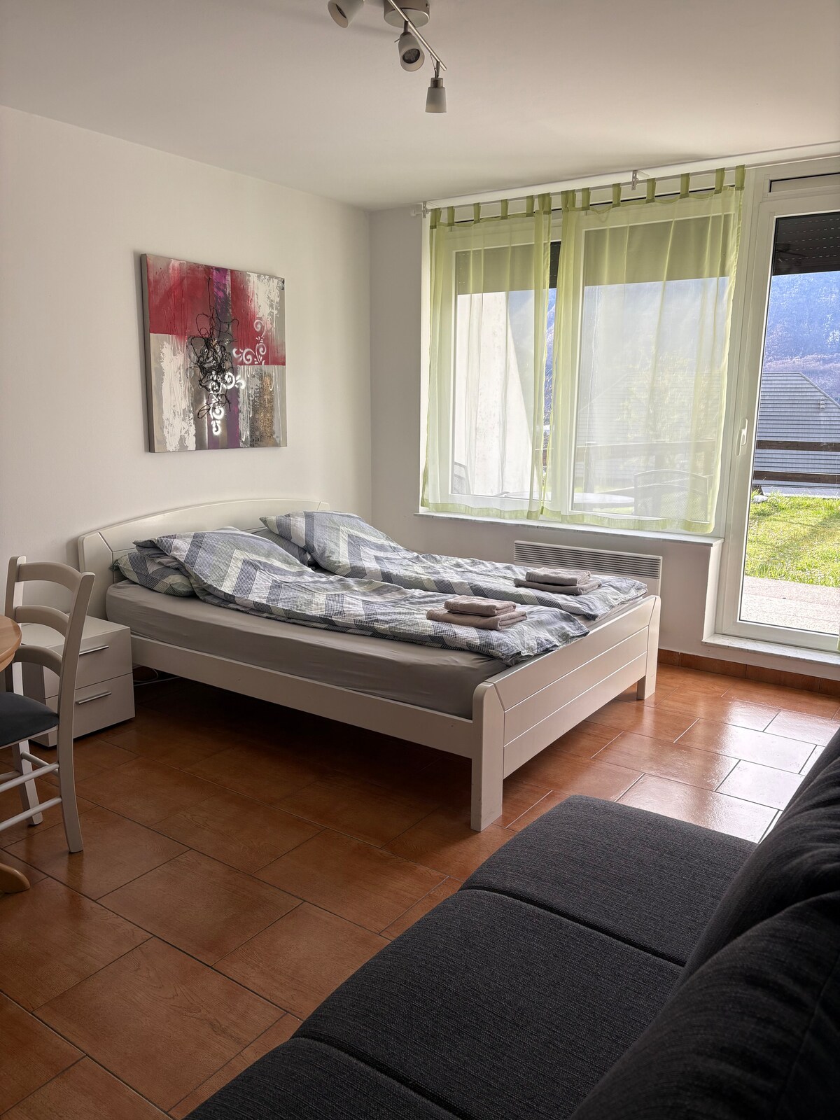 A cozy escape for two, just steps from the heart of Bovec. This ground-floor apartment features a private atrium with stunning views of the surrounding mountains. Tucked away in a peaceful setting, yet within walking distance to the town center, it’s the perfect blend of calm and convenience. Discover the magic of the Soča Valley – from crystal-clear rivers to breathtaking trails – and enjoy endless outdoor adventures like hiking, cycling, kayaking, rafting, or ziplining…