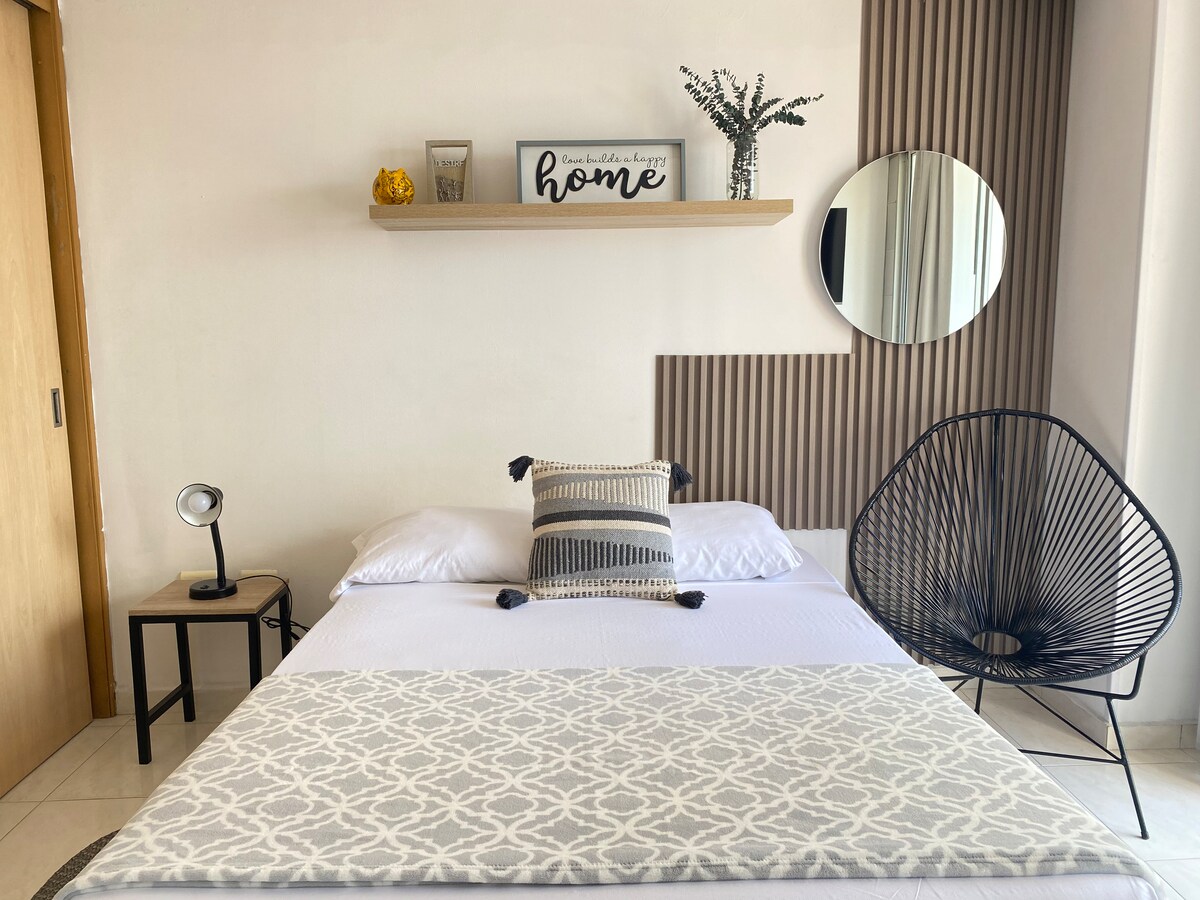 Nuestro apartamento es tipo loft lo hemos querido dotar con un decoración cálida y funcional que te hará sentir cómo en tu hogar. La cocina abierta te permitirá preparar tus mejores recetas y degustarlas alrededor de una barra americana moderna. La cama Queen cuenta con un colchón premium que te permitirá tener un sueño reparador. La ubicación estratégica te permitirá llegar fácil y rápidamente a las principales zonas.