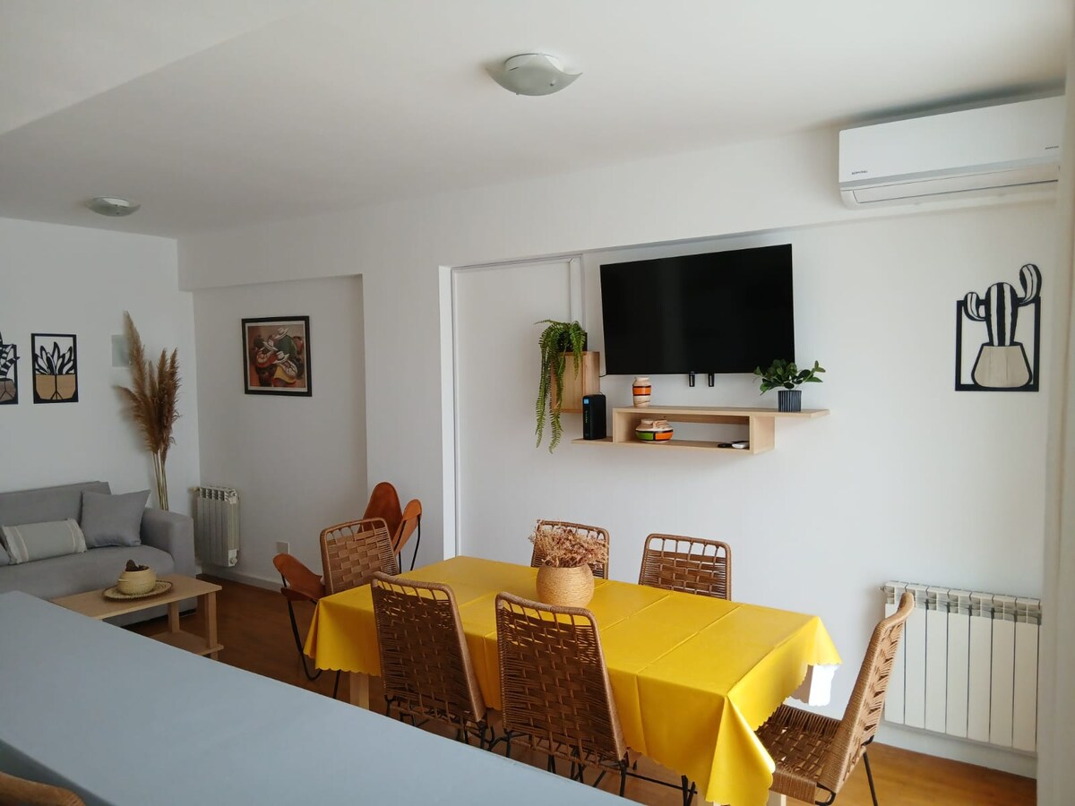 Cómodo departamento céntrico, ideal para familia, a 5 cuadras de distancia de la Plaza 9 de Julio, con cochera (solo para autos de porte chico, camionetas no) El departamento cuenta con cocina equipada, living-comedor, TV con Netflix y Starplus. Wi-Fi y ambientes acondicionados. Una habitación con cama matrimonial y otra habitación con dos camas individuales. El departamento cuenta con cochera