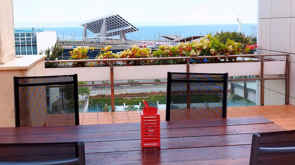 MODERNO ATICO VISTA AL MAR Y A LA MONTAÑA Parking incluido en el edificio 500 mts del Forum y Playa 500 mts Shopping Diagonal Mar y CCIB (Centro de Convenciones Internacionales de Barcelona) Juegos para niños en la propiedad Todos los servicios - Supermercado a 100 mts abierto de 8 a 24 de lunes a domingo. Estación del Tram en la puerta. Metro - Bus A 20 a 25 min del centro de la ciudad - Sagrada Familia - Ramblas Número Licencia HUTB-016211