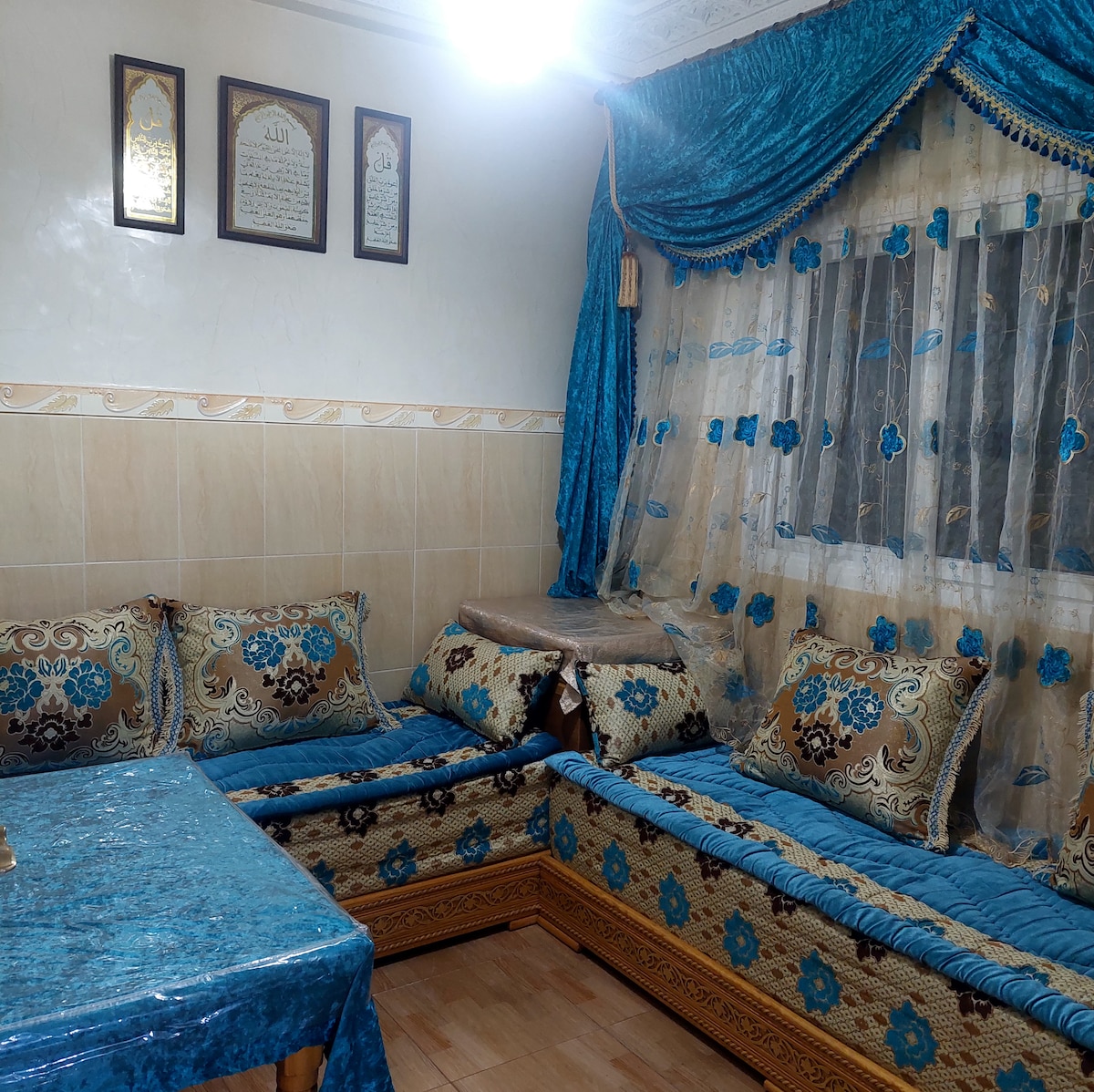Apartamento entero para los Huéspedes. A 20 minutos andando y en coche a 5 minutos de Nador centro. Moderno y luminoso, muy tranquilo, de 2 dormitorios, comedor, cocina y un cuarto de baño con mucho espacio. Nuevo, recién construido, situado en la primera planta, en una casa típica marroquí. Tiene acceso por las escaleras a una terraza y a una bella azotea con magníficas vistas al mar y a las montañas. Hay cámaras de seguridad en las escaleras, en la azotea y en la entrada de la calle.