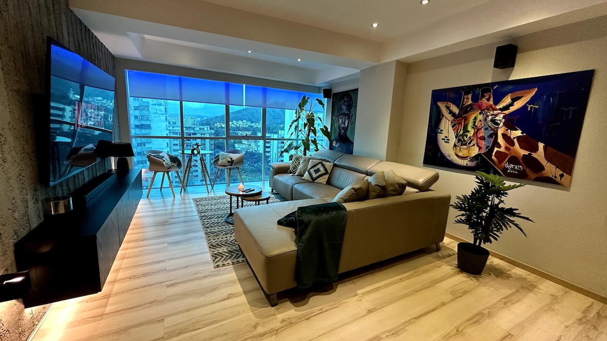 스타일, 편안함, 좋은 취향을 갖춘 숙박 경험을 해보세요. 이 아파트는 디테일, 분위기, 기능성을 중시하여 설계되었습니다. 가족이나 임원이 휴식을 취하거나 재택근무를 하기에 모든 편안함을 갖춘 아늑하고 현대적인 공간을 찾는 데 이상적입니다. 들어서면 디자인과 따뜻함이 완벽하게 조화를 이루는 것을 느낄 수 있습니다. 거실에는 현대적인 엔터테인먼트 가구와 55인치 스마트 TV가 있습니다.