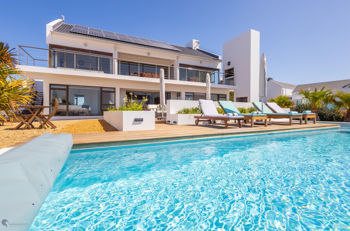 Weskus-Beskus is a recently completed 2 bedroom, dog friendly house on the beach. Purpose designed, in a modern West Coast Style. All rooms have ocean views. En suite bedrooms, quality beds and Egyptian cotton awaits you. Inside and outside braai areas and the third, a starry sky Boma Braai. Large veranda. Comfortable modern uncluttered interior. Stunning sunsets. Miles of safe, sandy beach. Bring your dog! 165 km from Cape Town, 13 km from Velddrif. All welcome.
