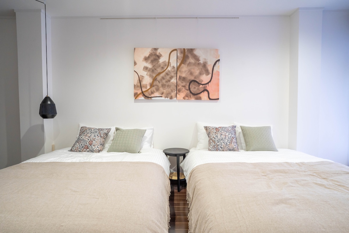 t3 HOTEL+ is a private house themed around STAY / GYM / ART. Named after the three tigers painted on each floor, symbolizing strength, sensitivity, and playfulness. Enter through the gym and check in via a real boxing ring. Inside, neon lights, sculptural furniture, and abstract art create a unique stay. Relax in a large bath or enjoy movies with a big projector. Easy access to Expo 2025! 30 mins by train from Nodahanshin Station to Yumeshima (via Awaza).