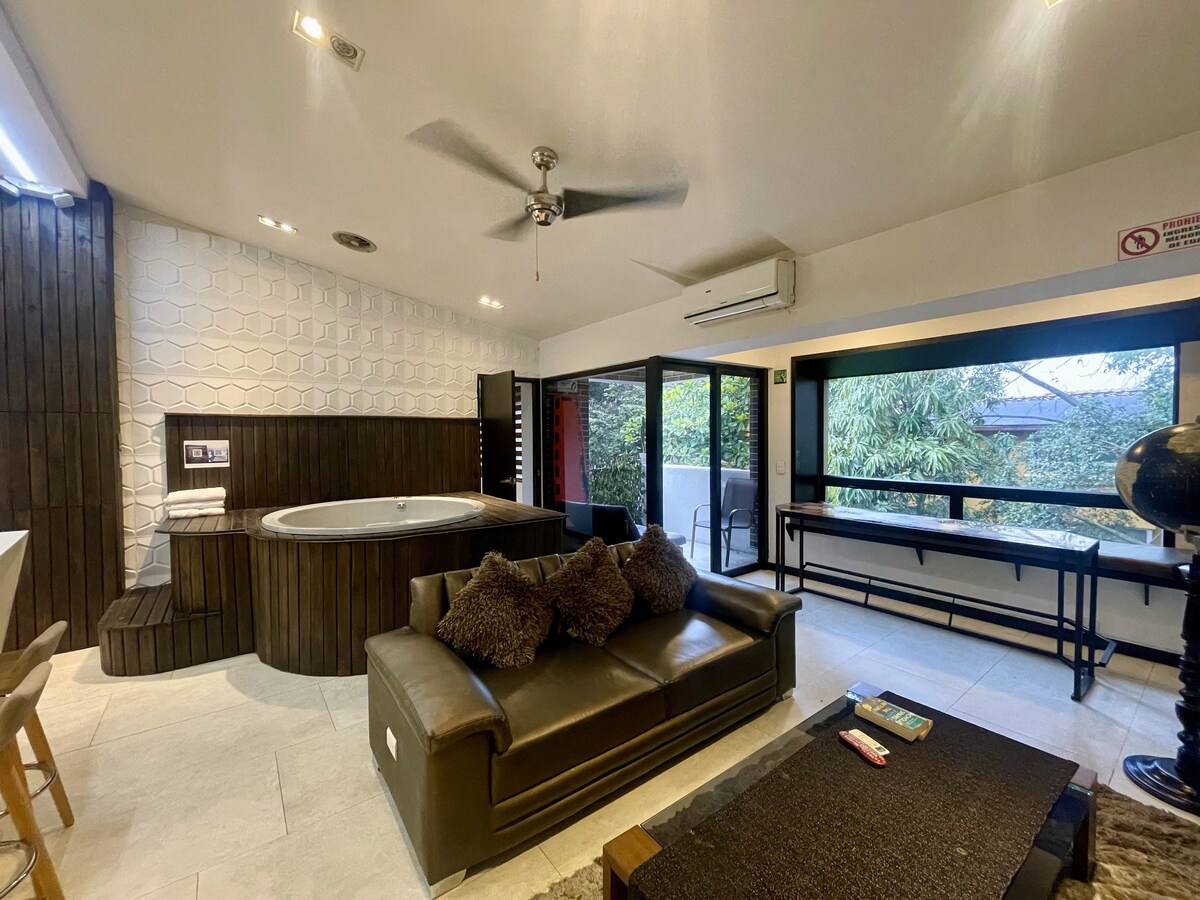 • Amazing location in heart of Poblado: "Oasis in the middle of the best part of the city, walking distance to everything” • Modern, fully furnished Loft • High speed 100 Mb WiFi • Loads of nature around • On-site staff to help you with your needs 24/7 • Air Conditioner • Pool + Hot Tub in the common areas • 5 mins walk to best restaurants, cafes, malls. 15 mins walk to Poblado and Lleras Park • Fully stocked kitchen with appliances • 43” Smart TV with Apps • Transparent prices
