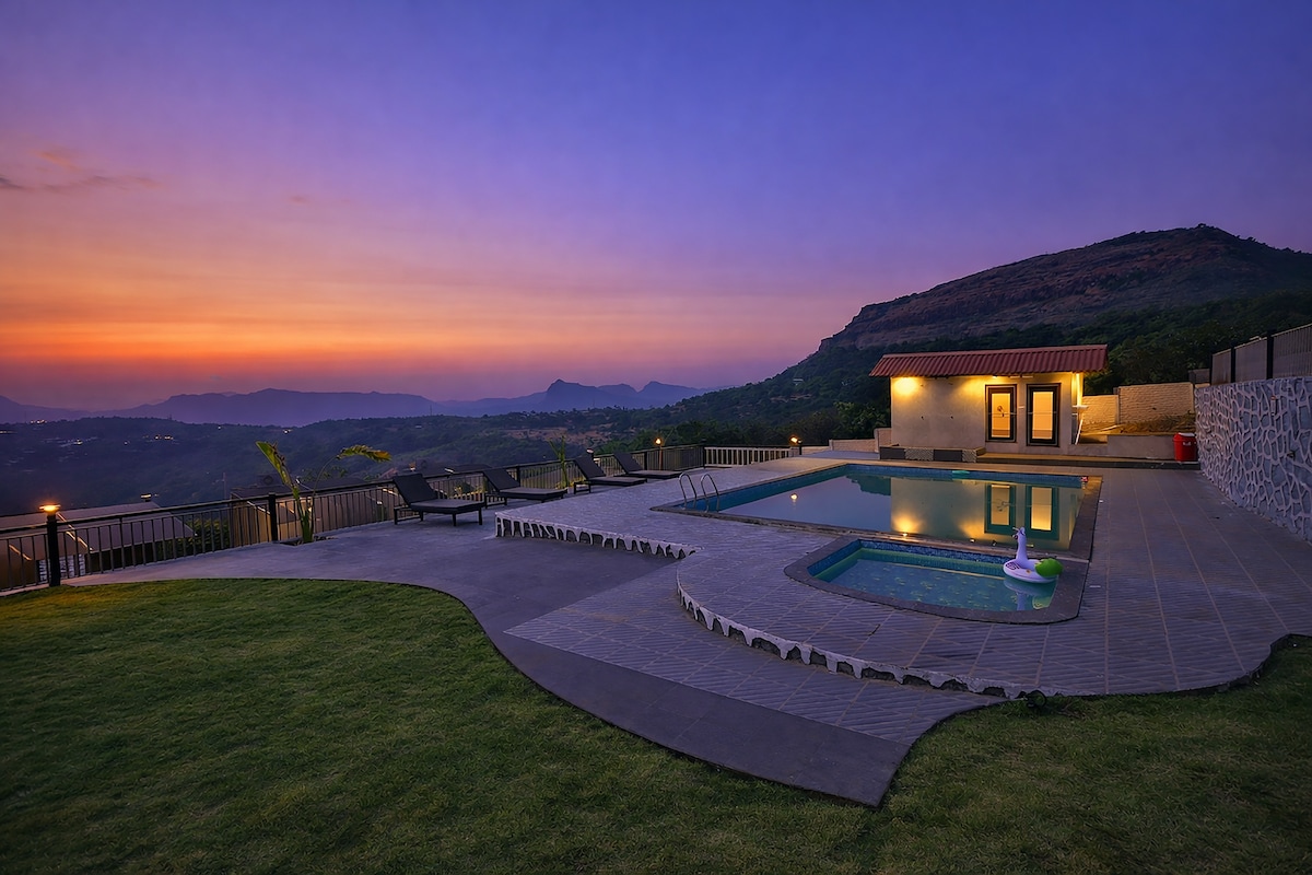 Set in the scenic hills of Karjat–Jambrung, this 2BHK villa offers uninterrupted 360° views of the Sahyadri range. Featuring a private pool with separate sections for adults and kids, a landscaped garden with a swing, and balconies in every bedroom with hill views, it’s designed for relaxation. The terrace overlooks nearby waterfalls, adding to the experience. With easy access to forts, dams, and nature trails, it’s an ideal retreat for a peaceful, private getaway.