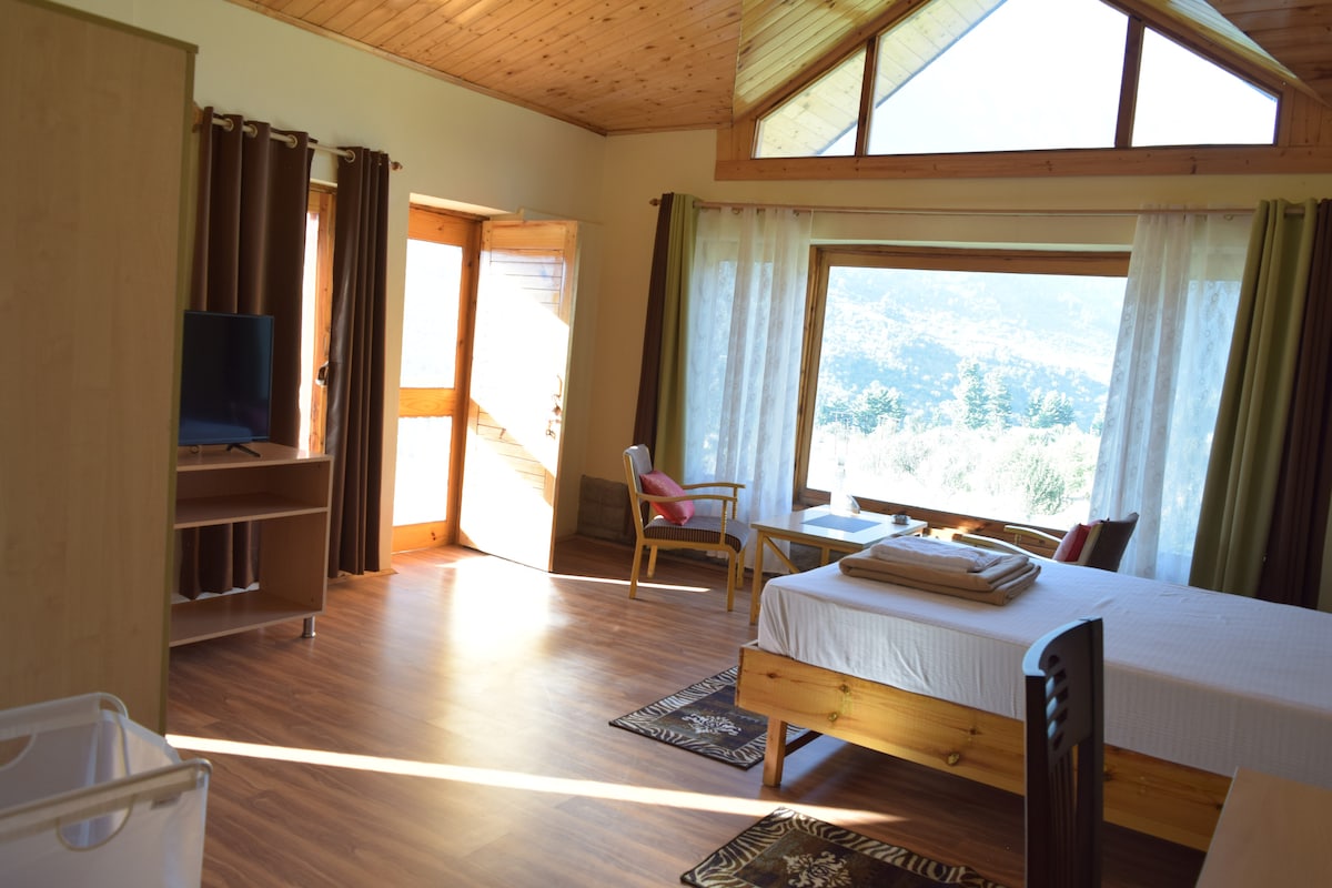 - 최상층 전체 - 난방 시설이 갖춰진 공용 좌석 공간 (호스트와 공동 사용) - 히마찰리 가족과 함께 사는 공동 생활 - 가정식 - 투명 지붕 (공용 공간과 함께 부착). 별 관찰에 사용할 수 있습니다. - 모든 객실에 딸린 발코니 - 원더러스트 그린 가든 - 초고속 인터넷 - 객실당 4명을 수용할 수 있는 중이층이 있는 방 2개와 싱글룸 1개로 최소 2개를 수용할 수 있습니다. - 주방, 객실 히터 및 모닥불/탄도어는 호텔에서 직접 결제할 수 있으며 엘리베이터가 없습니다.