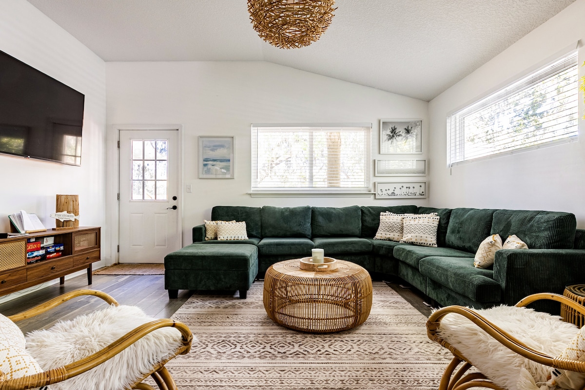 새롭게 단장한 세련된 숙소에서 온 가족이 함께 즐거운 시간을 보내세요. 모든 것이 현대적이고 최신식입니다! 불 옆 뒷마당에서 아늑한 저녁을 즐겨보세요. 마스터에는 스탠드업 유리 샤워기가 있는 전용 욕실을 포함한 킹사이즈 침대가 있습니다. 두 번째 침실에는 퀸사이즈 침대가 있으며, 그 옆에는 가든 욕조가 있는 두 번째 침실이 있습니다. 거실 소파가 꺼내서 퀸사이즈 침대를 만듭니다. 각 객실에는 좋아하는 프로그램을 모두 볼 수 있는 스마트 TV가 있습니다.