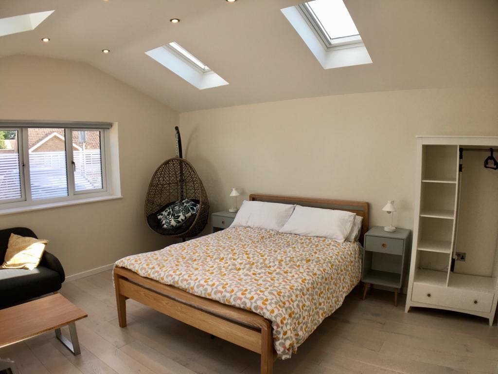 새로 지어진 28m²의 가든 스튜디오는 경치 좋은 캠강에서 도보 3분 거리에 있으며 캠브리지 중심가 근처에 편리하게 위치하고 있습니다. 아름답게 디자인된 이 공간은 킹사이즈 침대와 고급 소파를 갖추고 있으며, 바닥 난방과 블랙아웃 블라인드가 있어 아늑한 분위기를 자랑합니다. 이 정원 휴양지는 전용 야외 좌석 공간과 함께 편안함과 평온함이 완벽하게 어우러진 공간을 제공합니다. 숙소 내 주차는 불가능하지만 근처 주차장을 추천해 드릴 수 있습니다.