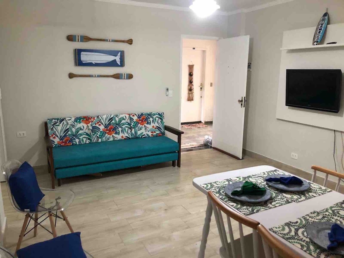 Apartamento aconchegante de frente para o mar. (50 metros) Linda vista do nascer do sol, da sacada e janelas. Praia familiar, ótima para crianças, tendo a opção de surf (lado esquerdo) e caminhada até o fim da praia (lado direito) para pescar, ver tartarugas e animais marinhos. Várias opções de lazer, entre elas: Banana-boat, passeios de escuna até as ilhas próximas. Redondeza com boa estrutura de mercados, farmácias, quiosques e restaurantes próximos, etc. Não precisa usar carro.