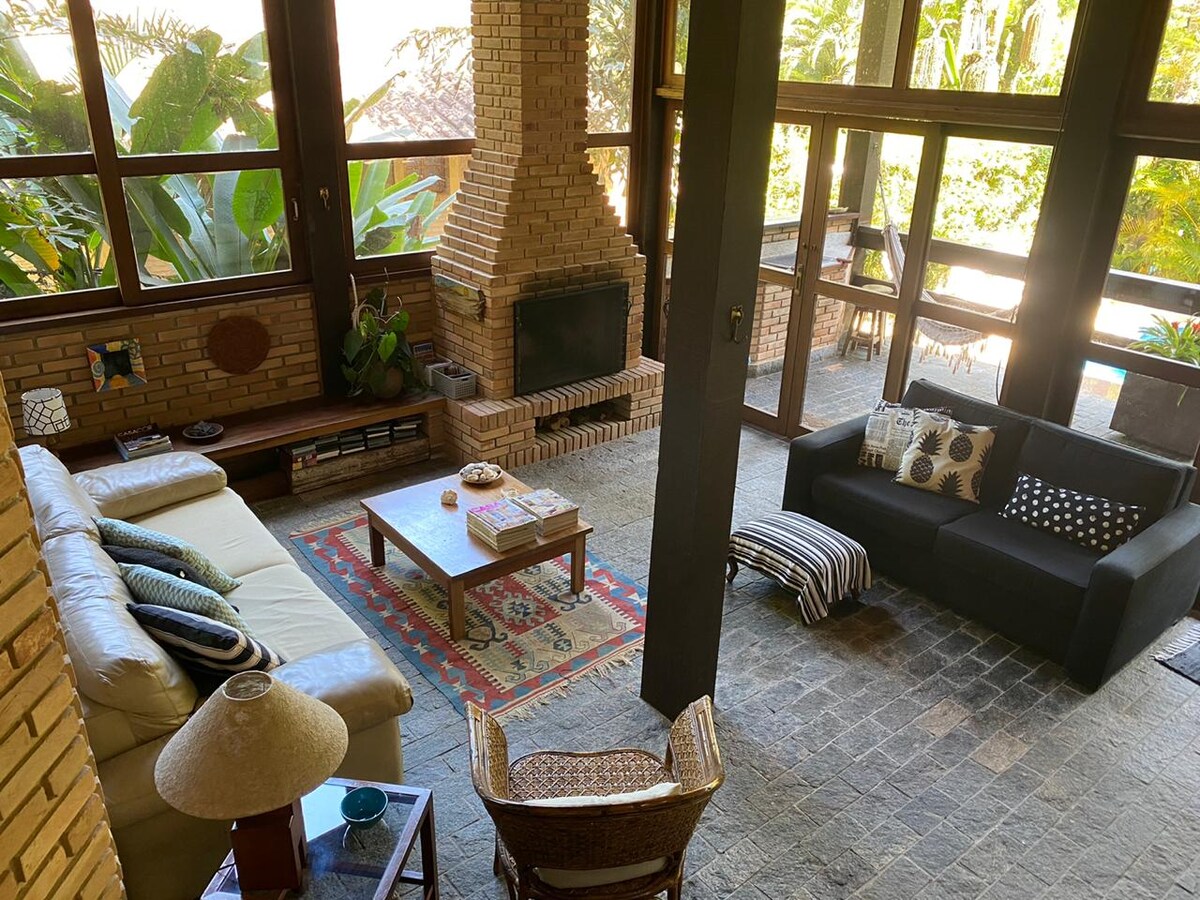 Projeto de Carlos Lemos, nossa casa é térrea, espaçosa, e super iluminada. Situada num terreno com vista privilegiada para o mar e as montanhas. Está cercada pela mata atlântica, com poucos vizinhos, à cerca de 500mts da praia. A casa é bastante equipada com uma cozinha e lavanderia completas, e tem internet rápida (100Mb) com wi-fi em todos os ambientes. A sala de estar tem lareira e a varanda área externa é bastante ampla com deck, redes e churrasqueira portátil.