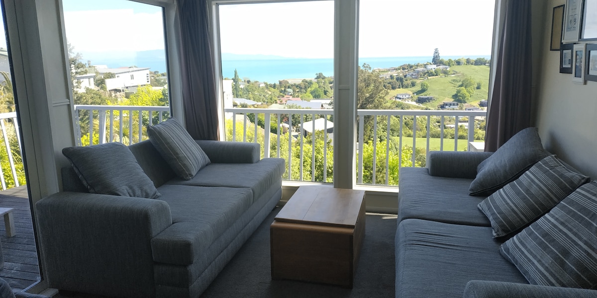 This house has stunning elevated views over Tasman Bay. Sit and watch all the ships, fishing boats and yachts going in and out of the harbour. It is in a very quiet location, yet only 5 minutes drive to the coast/beach and CBD. Or if you prefer walking, the town with all of it's boutique shops, pubs and restaurants is around 20 minutes away. The home has large open plan living, dining (extendable table and 6 chairs) and sun rooms, and kitchen area with large windows, elevated deck.