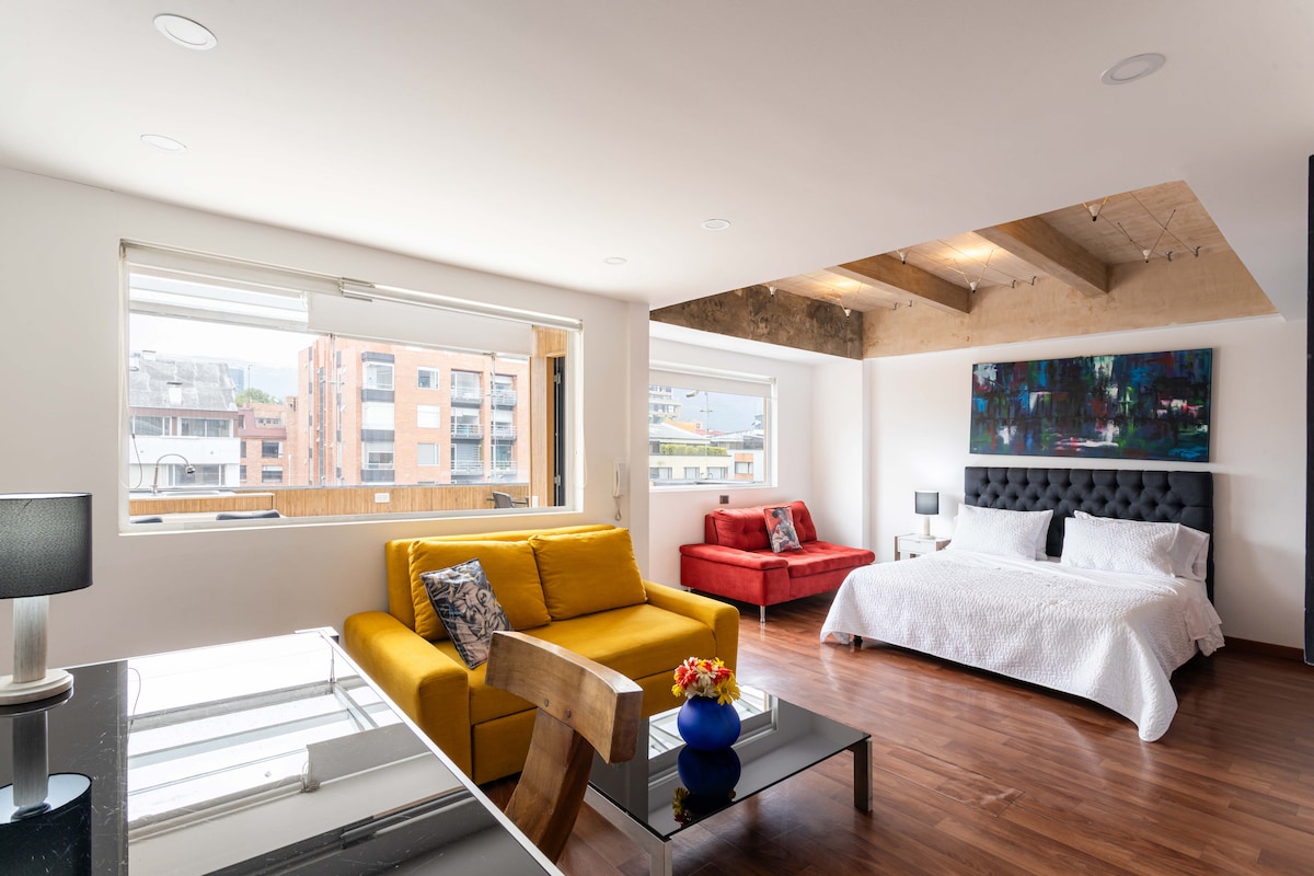 보고타의 모든 것에 가까운 로프트 스타일의 아파트 스튜디오.