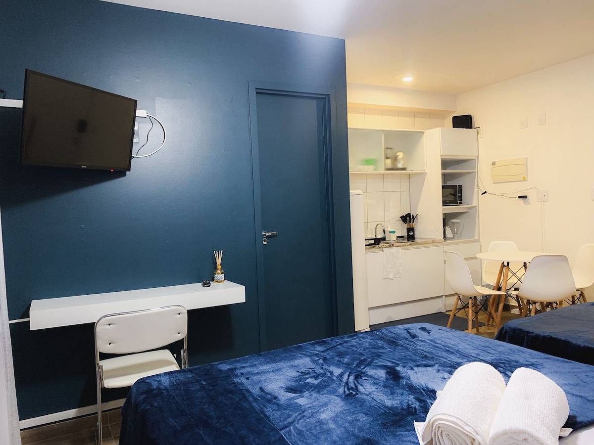 Studio com Wi-Fi, cozinha completa e metrô ao lado