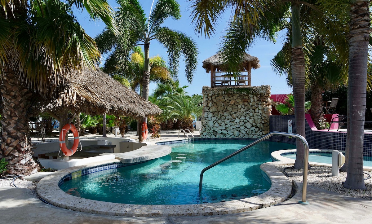 아늑한 해변 맞은편에 위치한 작은 규모의 보호 리조트에 위치한 매우 넓은 럭셔리 빌라(135평방미터)로 넓은 베란다와 다이빙 시설을 갖추고 있으며 보네르의 모든 놀라운 다이빙 장소와 가까운 거리에 있습니다. 밝은 수영장이 있는 이 리조트는 정말 열대적이며 최고의 카리브해 느낌을 선사합니다. 빌라 옆에 전용 주차장과 다이빙 장비를 보관할 수 있는 공간이 있습니다.