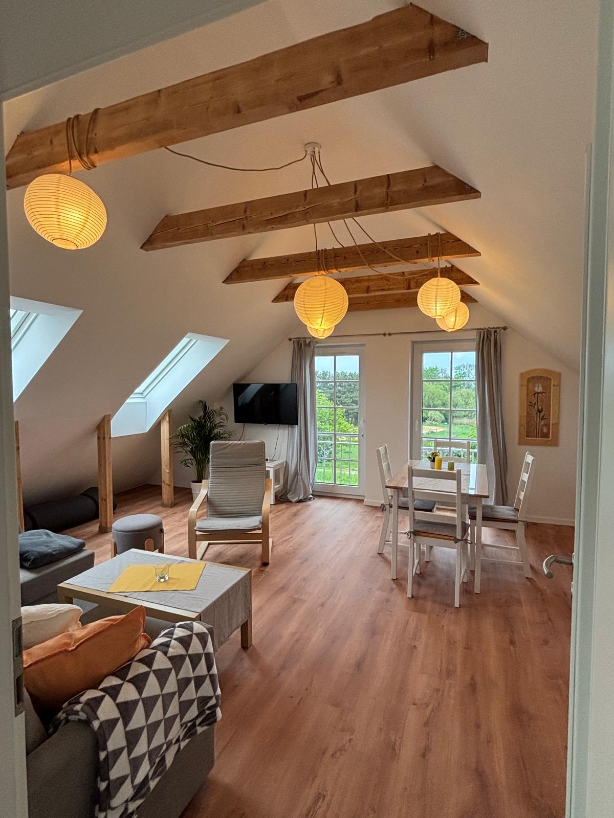 Auf unserem Hof findest du alles für ruhige Tage auf dem Land. Es gibt einen Bio-Dorfladen mit Café, eine Fasssauna und die Natur direkt vor der Tür. Viermal wöchentlich finden Yogakurse statt – ideal, um Körper und Geist zu stärken. Ein Parkplatz und eine E-Tankstelle sind vorhanden. Wir sind ein 4-Generationen-Hof mit nachhaltigen Projekten, darunter ein entstehender Permakulturgarten vor der Ferienwohnung. Die Wohnung ist ideal für Paare, ein Kinderbett stellen wir gern bereit.