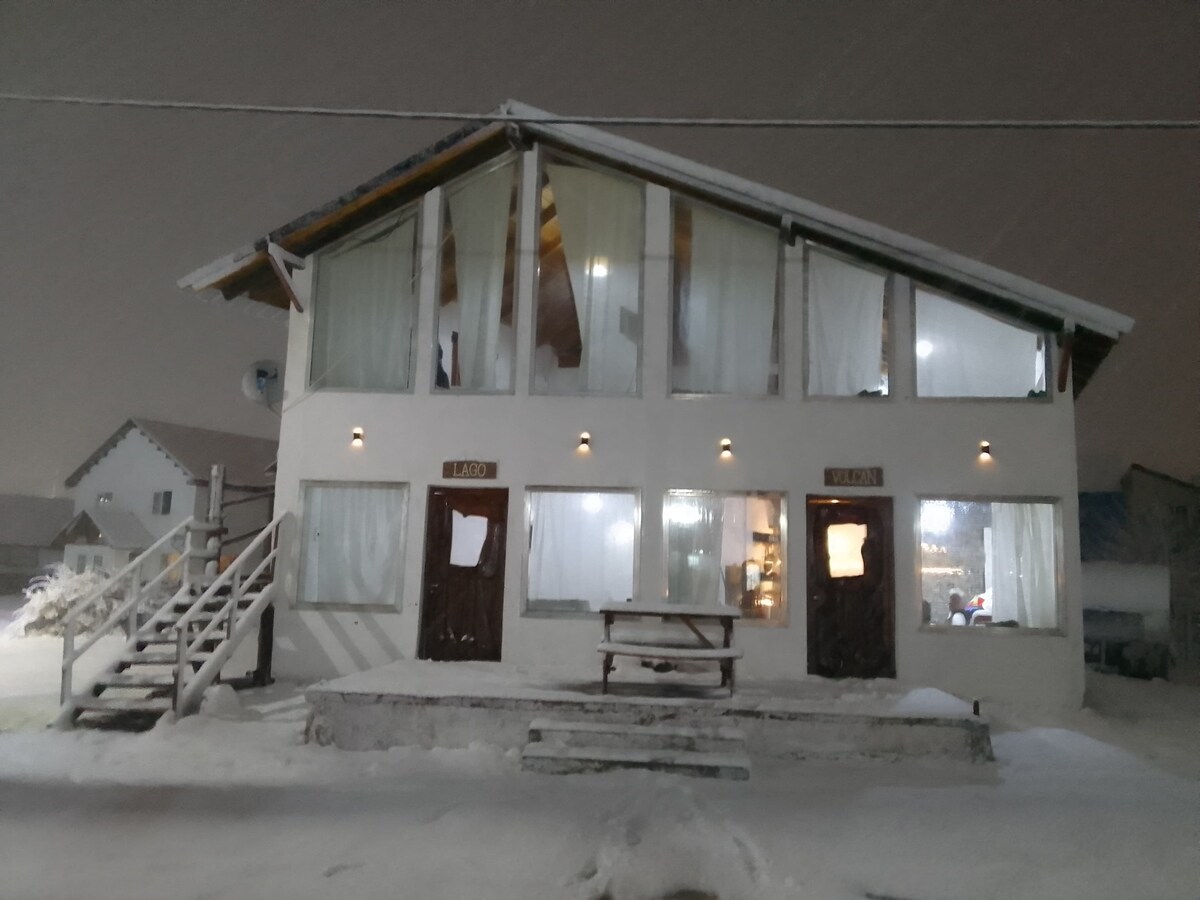 Atardeceres del Lago: Patagonian retreat with dreamy views of Nahuel Huapi Lake. Wake up to incredible panoramas and enjoy unique sunsets from your terrace. Heated pool with lake views. Units equipped with kitchen, microwave, TV, and private bathroom. Individual grill. Playroom with TV, foosball, and games. Ideal for couples in a tranquil and peaceful setting. Close to Victoria Island and Cardenal Samore Pass. Easy access from Bariloche (85km). Ideal for skiing and adventure all year round.