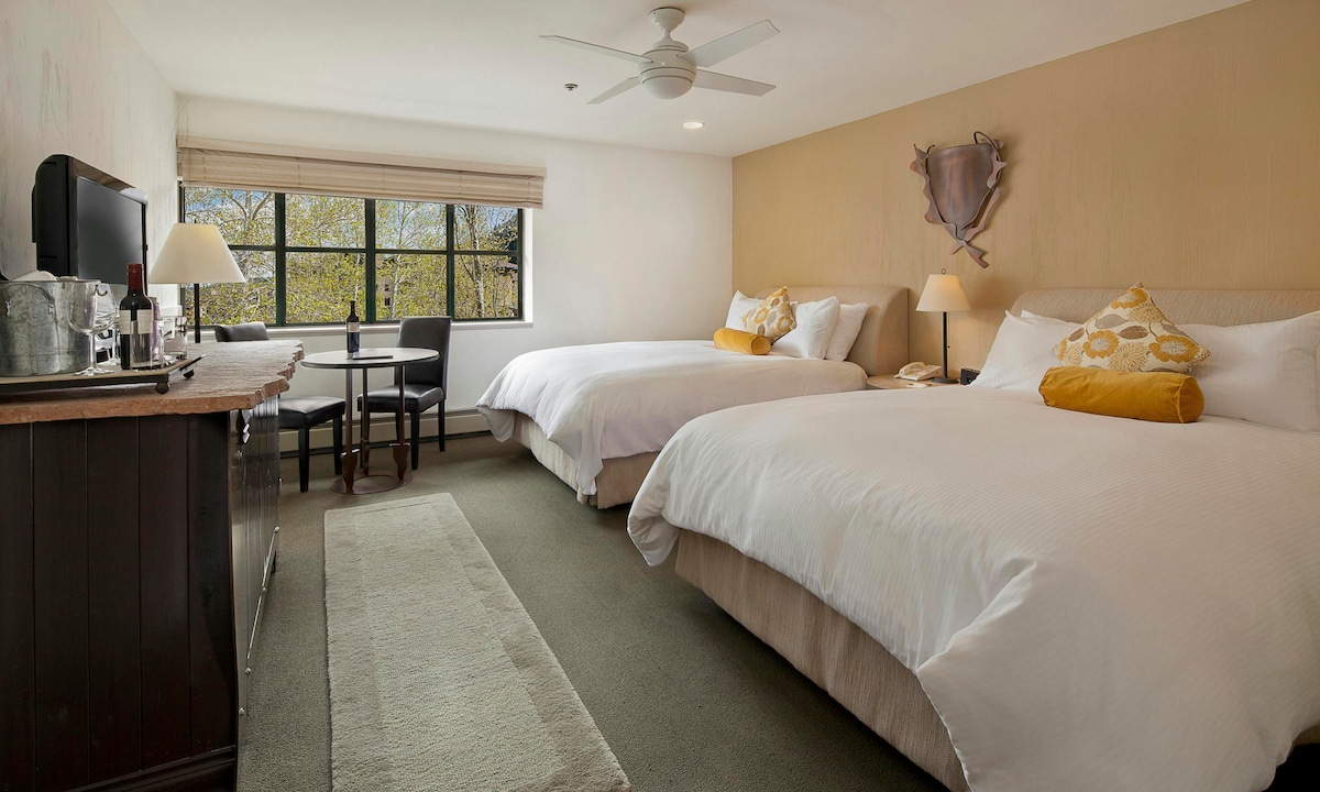 The double queen room offers a cozy Tahoe basecamp with mountain inspired touches, ideal for guests seeking comfort, convenience, and easy regrouping between adventures. Enjoy deluxe eurotop mattress, in-room heating and cooling, blackout shades, mini-fridge, smart TV, wifi, custom work desk, curated local art, and ski and snowboard wall hooks with workbench.