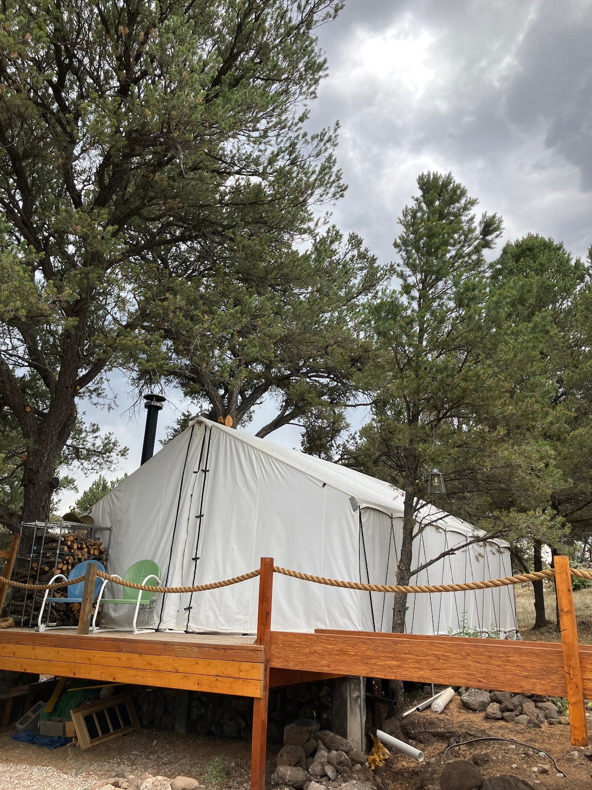 Glamping in Beautiful Jemez Mtns. Short distance to Jemez Springs Village, Ponderosa Winery and Hot Springs. 19-acres w/amazing views. Pictures cannot do justice! Relax in a beautifully decorated 14/16ft canvas tent stocked with comforts from home. King bed, Full size futon, quality linens, hardwood floors & comfortable décor make this glamping feel like a real vacation! Hiking/Fishing/Tunnels/Ruins. We have four tents available for rent, rent more than one for groups or large families.