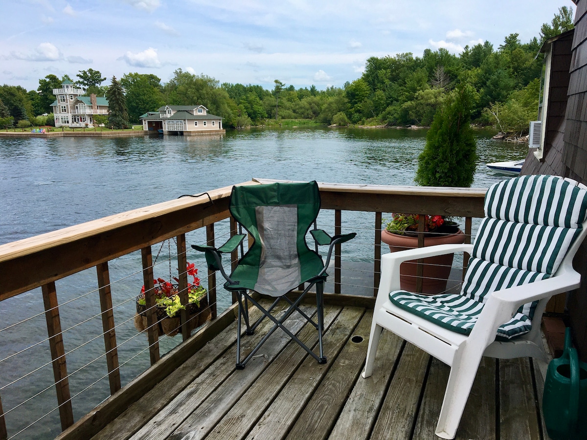 Pleasant & cheerful 2BR 2BA above boathouse on an island in the Heart of the 1000 Islands. 5 minutes outside of popular Alexandria Bay & Boldt Castle. Apartment is directly above the boat slips. Stairs of about 10 steps to front door. NOT suitable for young children, pets, anyone w/mobility concerns. Swim from the dock, relax on the deck, enjoy exploring the river. A boating paradise! Must have a boat! If renting locally, we can make suggestions. Large boats OK, 74 ft dock!