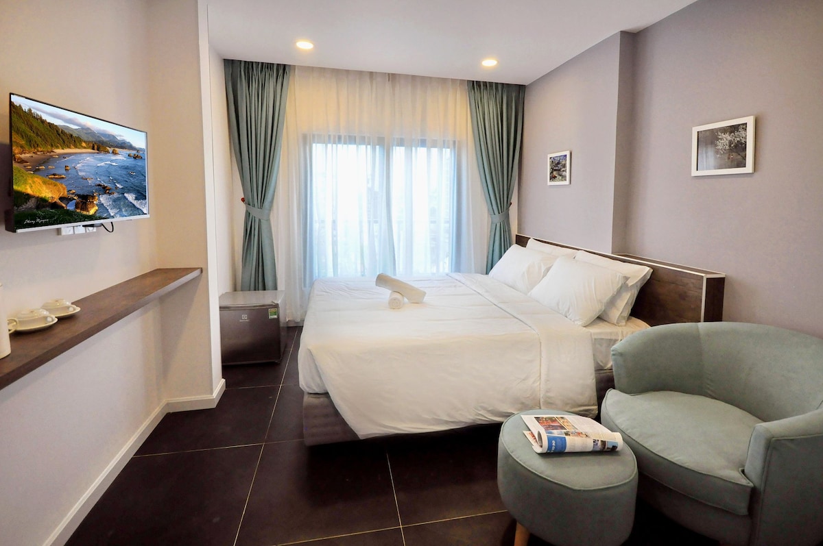 DISCOUNT 20% In front of our hotel, the beach and sea are amazing! You will have a memorable trip in Nha Trang. Having a stunning view, this room is comfortable for 2 person. We make sure it fresh & clean. - 1 queen bed - Bed is very comfortable - Window & lots of natural light - Private bathroom & full of essenitals - Elevator, air conditioner, fridge, water kettle, fast wifi, TV, table, chair, hair dryer - FREE cleaning service & parking - Receptionist works 24/7 #Add: Pham Van Dong street