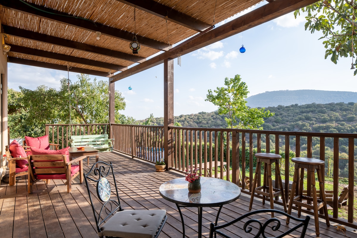 A 140 mr unique colorful mountain top villa surrounded by nature with panoramic breath taking view, 30 minutes from the Galilee Sea, Aco ,Nazarha Zafat. Fully furnished Lower level including a living room with cozy fire place and comfortable sitting area. Spacious upper level gallery sleeps 13 people comfortably in an open space. You can enjoy 60 meters of a private beautiful luscious garden. A peaceful atmosphere that is perfect for friends gathering or family vacation. workshops available.