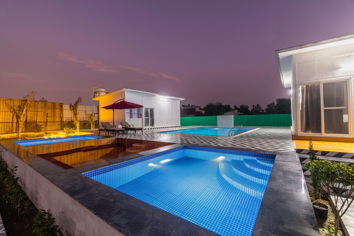 โ Located near Noida's popular malls, this pet-friendly 3-BHK farm villa offers a refreshing escape with a private pool, outdoor bar, and a laid-back atmosphere. โ With modern amenities, it features a stylish living space, a serene outdoor seating area, three cosy bedrooms, and a charming garden with a dedicated picnic spot. โ For added fun, enjoy outdoor sports with equipment like an exercise bike, bicycle, trampolines, and a TT table in the garden.