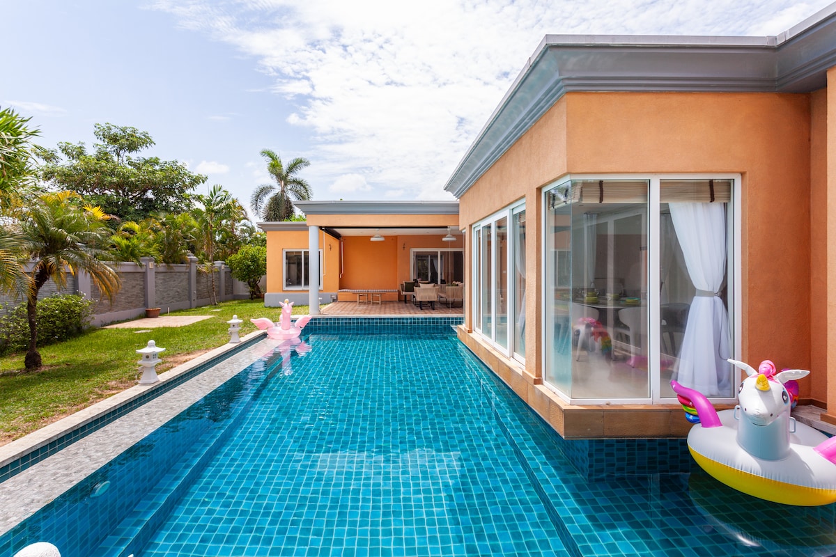 拎包即住,度假首选! 交通位置: 到步行街 7 分钟 到中天海滩 5 分钟 到芭提雅海滩 8 分钟 到格兰岛码头 7 分钟 到唐人街 15 分钟 到 terminal 21 17 分钟 到悬崖日落餐厅 8 分钟 位置优越!几分钟车程可抵达芭提雅市中心,附近有丰富的购物、美食和娱乐选择,生活非常方便。交通网络完善,去哪都方便,适合度假也适合长期居住。 别墅亮点 : • 三卧五床,每个卧室各有一张床 ,楼上楼下的客厅分别各一张床,带独立浴室:全家或一群朋友一起住完全没问题,宽敞又私密。 • 私人泳池:享受专属泳池的清凉惬意,随时畅游,完全不用和别人共享。 • 齐全厨房设备:别墅内配备微波炉、冰箱等,随时享受家常餐。 • 高品质家具和家电:拎包入住,家里所有的家具、家电、生活用品都配备齐全,不用再额外添置。