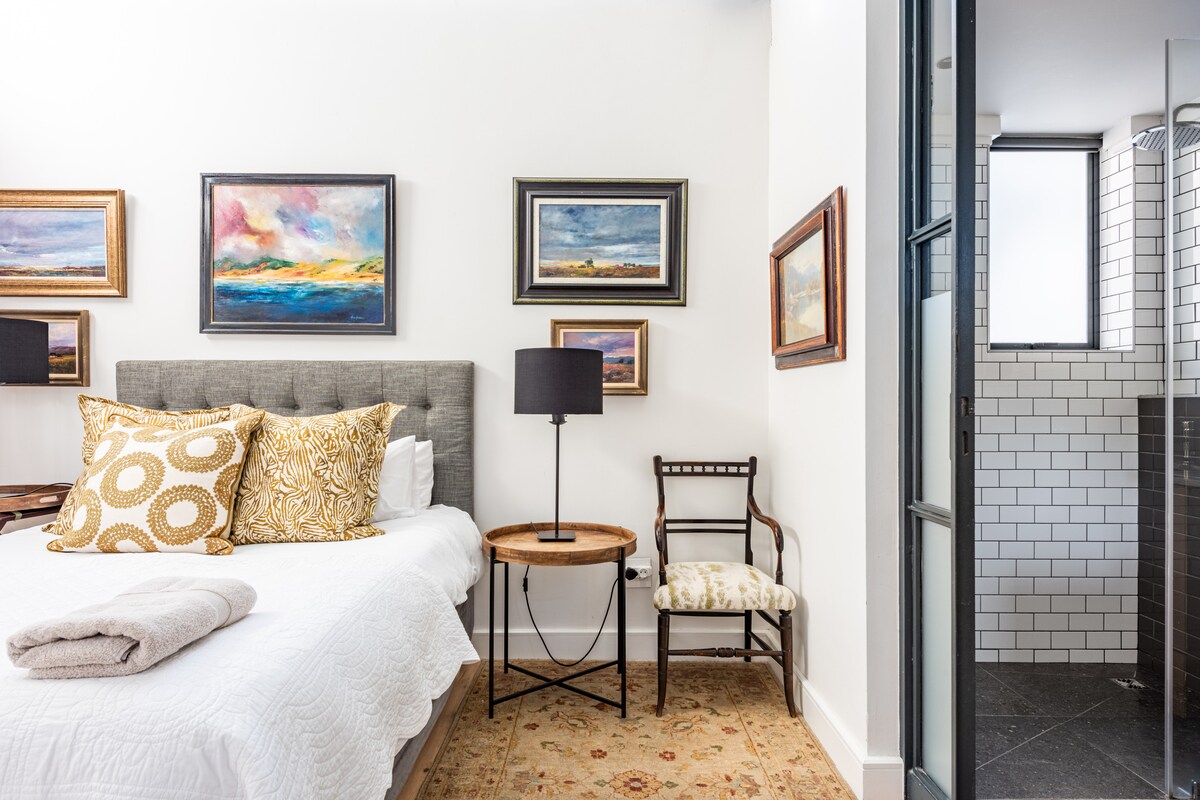 저희 스튜디오 아파트는 40평방미터의 발코니로 연결되며 후트 베이 밸리와 헬더베르크 산맥의 파노라마 전망을 감상할 수 있습니다. 커다란 슬라이딩 도어가 벽에 사라지면서 방해받지 않는 실내/야외 흐름을 만들어내고 높은 위치는 프라이버시를 보호합니다. 개방형 욕실은 프레임 없는 유리 샤워실이 있는 둘러싸인 비밀의 정원을 마주하고 있습니다. 시설이 완비된 간이 주방이 있으며 주말과 공휴일을 제외하고 매일 서비스가 제공됩니다.