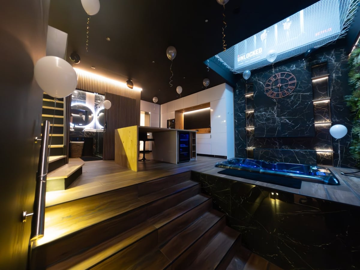 Découvrez le confort ultime dans notre appartement de 80m2, situé entre le Louvre Lens et le stade de Lens. Profitez d'un jacuzzi 2 places avec 95 jets, d'une TV OLED 4K de 165cm. La cuisine équipée. La salle de bain offre une douche italienne, des toilettes suspendues, un miroir LED anti-buée et un sèche-serviette. La chambre dispose d'un grand lit 180x200cm un filet suspendu de 10m2 avec une toile 260cm d'un canapé, d'une table basse, et d'une machine Nespresso un vidéoprojecteur UHD 4K HDR