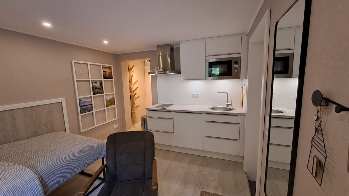 아늑하고 락하며 밝고 세련된 새로 단장한 아파트: 현대적인 침실 + 고급 박스스프링 침대 및 스마트 TV가 있는 침실 1개 거실 + 아늑한 좌석 및 TV 완비된 주방 + 의자 4개가 딸린 아늑한 식사 공간 + 기름, 커피, 차, 소금, 후추, 현대적인 욕실 + 샤워, 변기, 세면대 및 창문 2개 외출 + 주차 및 자전거 무료 이용 가능 + 자전거, 자동차 및 버스로 시내까지 빠르게 이동 가능
