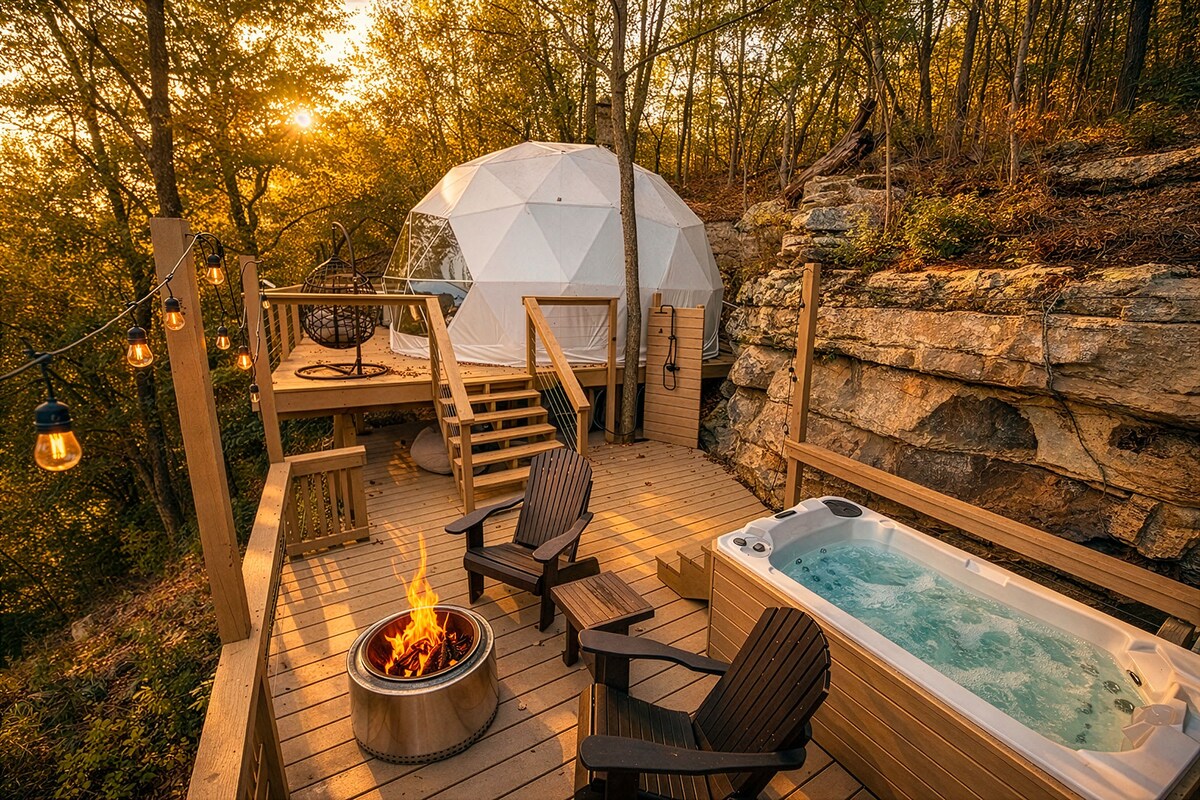버지스 폴스 돔은 센터 힐 호수가 내려다보이는 위치에 자리한 숙소로, 글램핑의 매력과 현대적인 편안함을 모두 갖추고 있습니다. 연중 숙박이 가능하도록 단열이 완비되어 있으며, 퀸사이즈 침대와 풀아웃 소파가 있어 4명이 숙박할 수 있습니다. 온수 욕조, 화덕, 바비큐 시설이 있는 전용 데크와 간이 주방, 욕실, 스마트 TV, 에어컨/난방 시설을 즐기세요. 버지스 폴스 주립공원, 하이킹 트레일, 폭포, 마리나 보트 대여에서 불과 몇 분 거리에 있습니다.