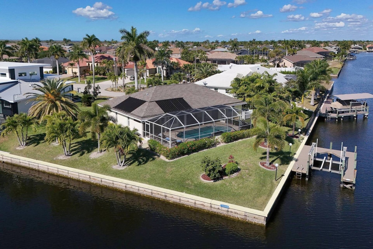 Villa Salt & Sol, an elegant, Coastal retreat in the yachting community of Cape Harbour, Cape Coral. Framed by stately royal palms - just two blocks from Camelot Park - pickleball courts, playground + picnic areas, VILLA Salt & Sol blends upscale comfort w/coastal tranquility. β’ Gulf Access β’ 4 Kayaks β’ Dock w/13,000lb boat lift/Tiki Hut + glass bottom viewing area β’ Smart TVs in bdrms/2 liv rms/pool area β’ Beach/Fish Gear β’ Dog OK β’ Fenced yard β’ Free HTD Pool β’ Adults/Kids Bikes β’ Baby Gear