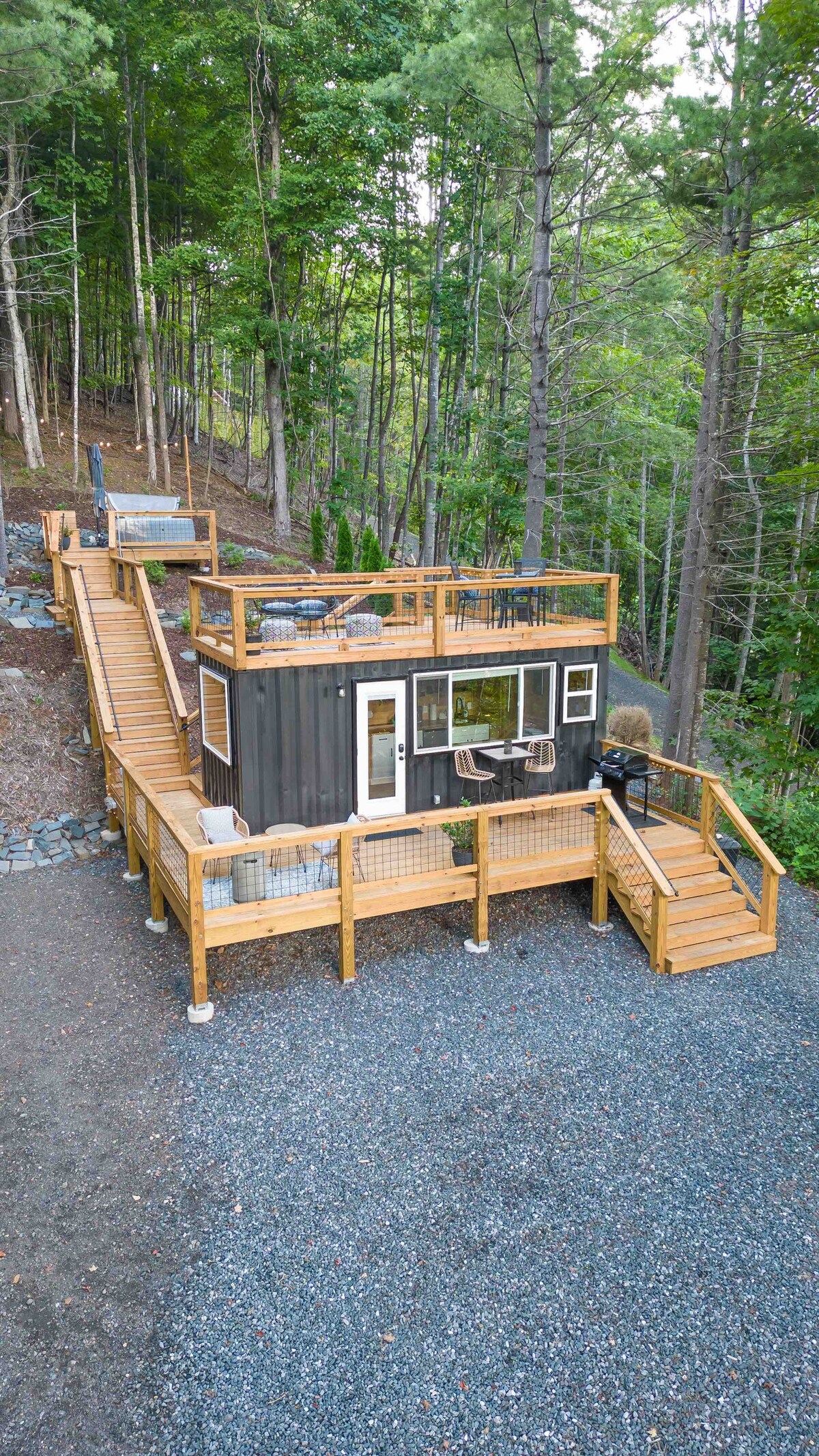 As featured on A&E’s Living Smaller (Episode 1), the Tiny Sustainer offers a unique and upscale experience. Have it both ways with a retreat in nature AND a 10 minute drive to historic downtown West Jefferson or quaint Todd or 25 minutes to Boone. Enjoy the well appointed custom shipping container home with 3 decks, hot tub, fire table, wood burning fire pit, grill, hammock area, dining nook, and comfy outdoor furniture. Relax and refresh while experiencing the joy of tiny living!