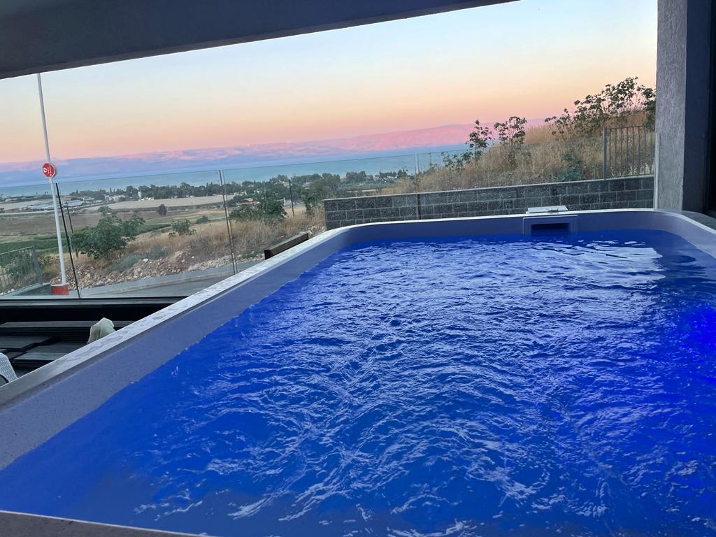A beautiful apartment with a balcony with a private pool, overlooking the breathtaking views of Sea of Galilee, located in prime location! The apartment features a living room, kitchen, dining area, 2 bedrooms, and 1 bathroom. A large balcony with a private pool ( 2 by 3 meters), seating area and gas BBQ. For up to 5 guests. Everything you need for the perfect Vacation: From bed linen, towels & kitchen appliances. The suite is ready for your arrival. Private Parking.