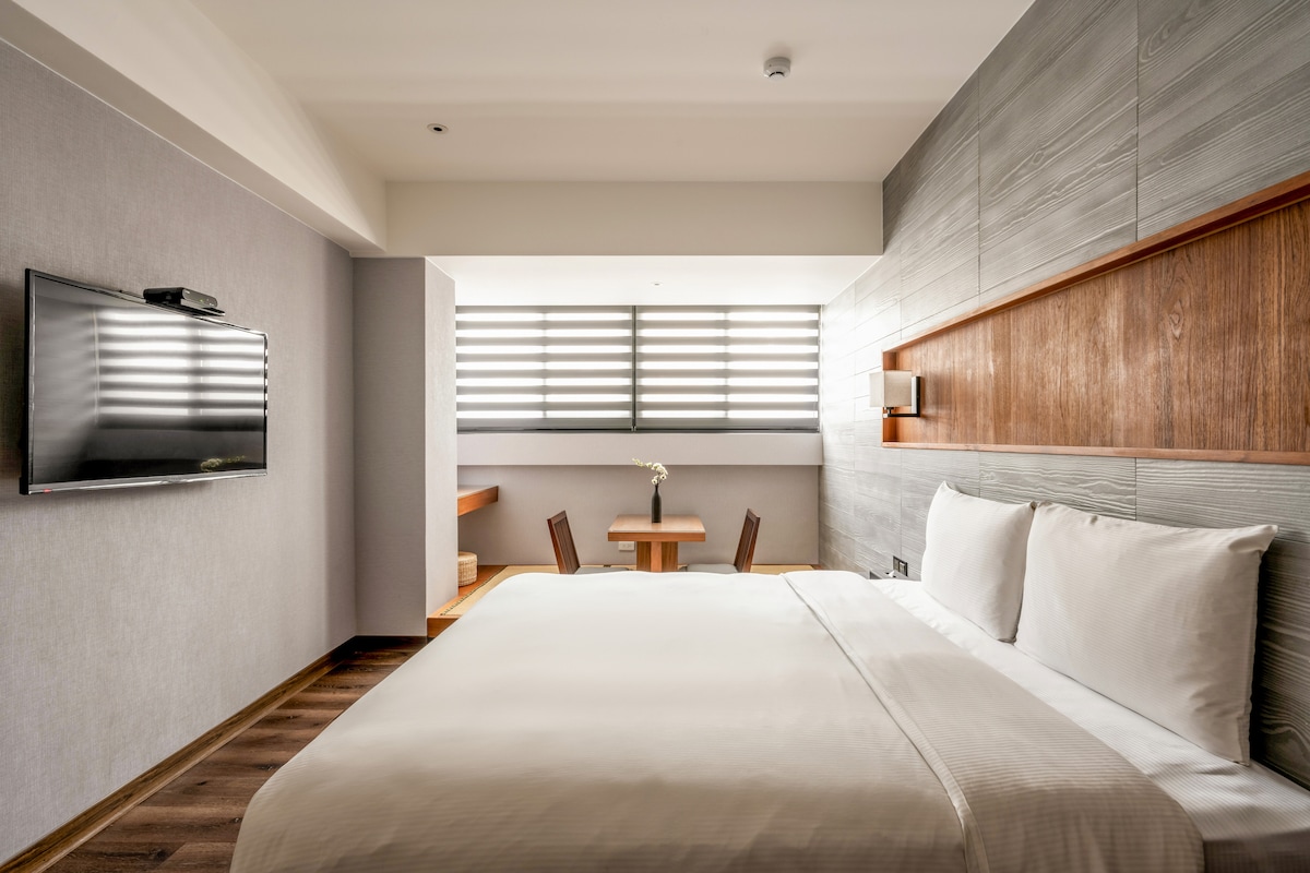 位於台中市中心的高樓層雙人房, 全新升級空間,採光充足、安靜好睡。 適合商務出差、情侶入住,或想在城市中好好休息的你。 ⸻ 🏨 房源介紹 這是一間位於市中心、近期完成升級的雙人房型, 整體以溫潤中性色調與柔和間接照明打造,氛圍安靜、舒適,帶有城市中的放鬆感。 房內配置大尺寸雙人床,重視睡眠品質;床尾設有電視牆,另搭配沙發與窗邊採光區,空間感比一般市區房型更為寬敞,適合休息、閱讀或簡單工作。 高樓層窗景白天自然光充足,夜晚則保有良好隱私與安靜度, 是城市中難得的靜謐住宿選擇。 ⸻ 📍 周邊與位置 房源位於台中市區核心位置,生活機能便利, 鄰近主要幹道,餐飲、咖啡廳、便利商店皆在步行或短程車程範圍內。 無論是: • 商務出差 • 城市小旅行 • 展覽、聚會或短期停留 都能輕鬆安排動線,是一個兼顧便利與安靜的城市住宿點。 ⸻ 🛏 房間配置 • 大尺寸雙人床(全新寢具) • 電視牆配置 • 室內沙發座位 • 大面窗戶、良好採光 • 空調、基本收納空間 • 免費 Wi-Fi