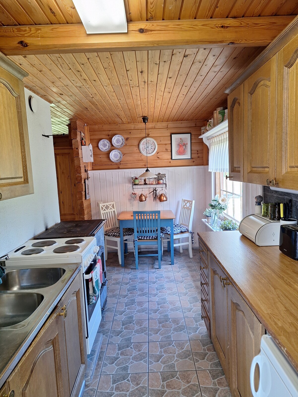 이 평화로운 숙소에서 온 가족과 함께 휴식을 취하세요. 통나무집 1982, 2011년 리노베이션, 2인용 주방-거실 추가 침대, 더블 침대가 있는 침실, 다용도실/드레스룸, 장작을 태우는 사우나, 사우나 샤워실, 유리 베란다 2개, 오픈 베란다. 주방에는 장작 난로도 마련되어 있습니다. 커플과 자녀 커플을 위한 느슨한 공간. 여분의 침대 (에어매트리스) 와 어린이를 위해 펼 수 있는 소파가 있습니다. 전원주택에는 냉방 기능이 있는 공기원 히트 펌프가 있습니다.