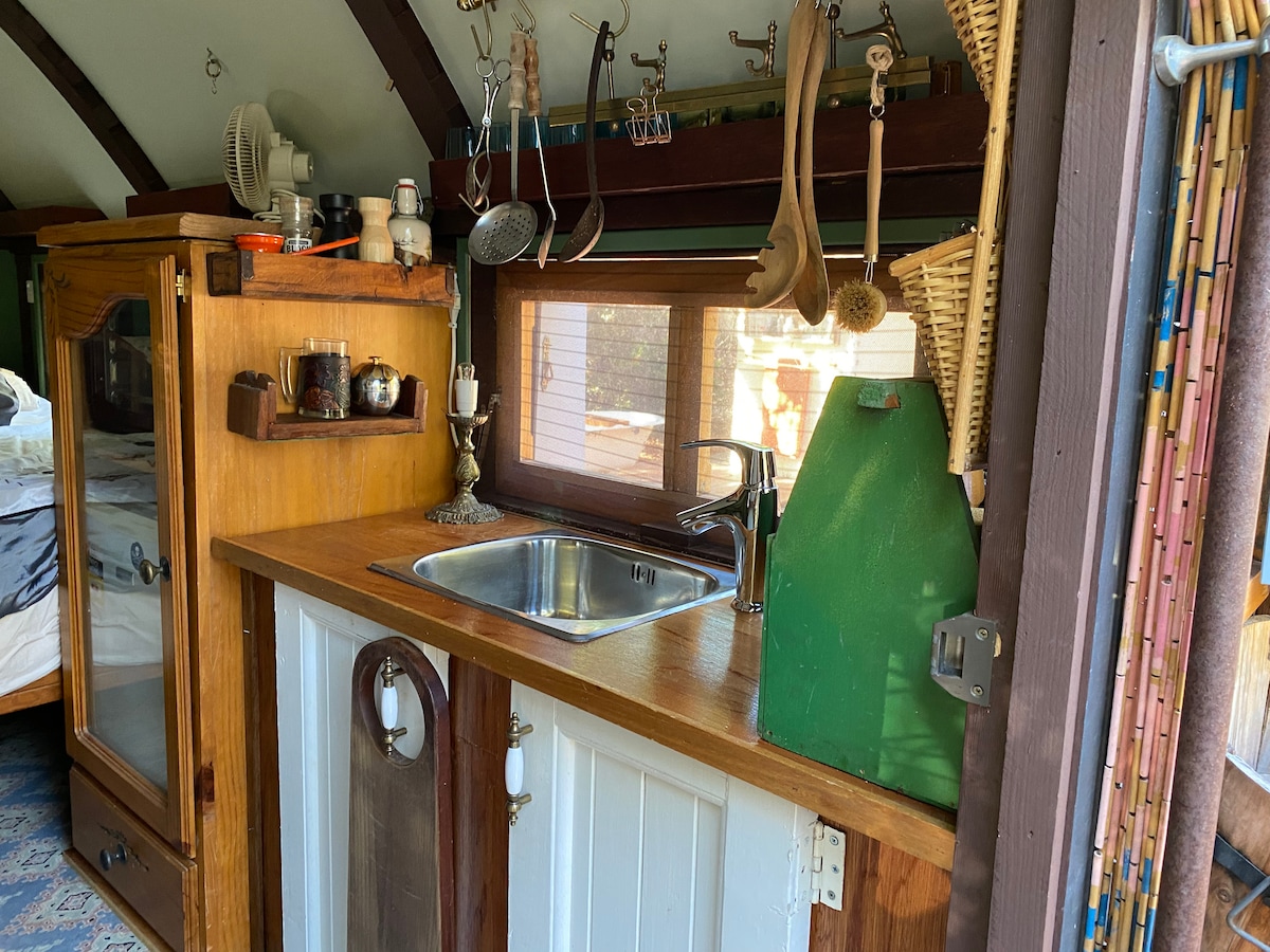 독특한 야외 욕실을 갖춘 집시 밴 초소형 주택