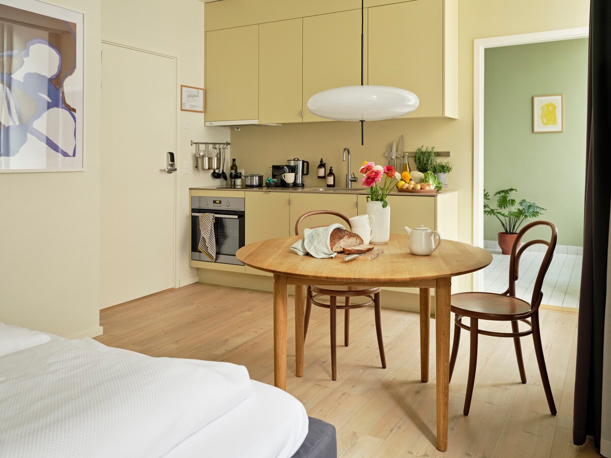 We are Aperon, an apartment hotel on a pedestrian street in central Copenhagen, housed in a building from 1875. The apartments are thoughtfully designed, combining a contemporary look with practical layouts. All units have access to a shared courtyard and terrace with views of the Round Tower. With easy self check-in and fully equipped apartments, we offer the ease of a private home, with access to our hotel services.