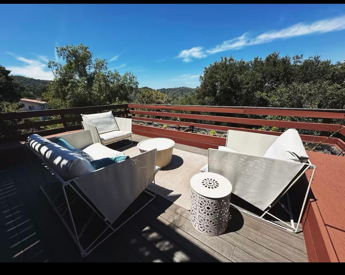 Step back in time in this 70s-inspired 2-story space designed to make the most of the view. Thoughtfully collected vintage pieces blend with numerous plants, plentiful books, and a record player. Watch bountiful wildlife through the windows. NOTE: we live in an area surrounded by wildlife, horses, dogs and a vast array of plants (our neighborhood is called Fernwood because it is the most green & lush from the ocean marine layer) so if you have allergies or asthma, this place may not be best for you. We also occasionally allow dogs, only if approved in advance. The upstairs space is bright and airy and all about the view! The kitchen is filled with a mix of 2nd hand and new kitchen tools. I love collecting beautiful wooden bowls and ceramics, perfect for showing off your homemade dishes. We try to keep the kitchen stocked with some basic essentials like olive oil, balsamic vinegar, sea salt, garlic, mustard, ketchup, soy sauce, and more - this way you don't have to stress about picking up so many items at the store. The bathroom is small and minimal, but has everything you need. I also included a basket with beach towels. Head downstairs to an open bedroom with wood ceilings and a large closet. The bed is a brand new Tuft & Needle King. There is a desk if you find yourself needing to do some work. The room opens up to an enclosed semi-private outdoor space. We live across the way in the main house so you may see glimpses of us through the privacy partition. I am always happy to share any herbs or veggies in the garden. There are concrete floors and lots of natural wood elements throughout the space. There is a wall heater in each room to keep things cozy. Our home was built in the 60s and then updated a lot in the 70s/80s when a hippie commune called the "Peace Farm" lived here. It has a lot of quirks, but that is why we love Topanga :) On the other side of your patio is our courtyard which features two garden beds. Feel free to check them out and pick some herbs. We often see raccoons, bobcats, squirrels and even an occasional snake in our yard, so always be aware of where you are walking. Your private entrance is right next to your parking space in the driveway, so there is a chance you may not encounter us at all. We work a lot and are always out and about, however, we love meeting guests so we can be available if you'd like to meet and get some local tips. Or if you prefer, we can totally keep our distance ;) Stroll the secret trail nestled moments away to meet some friendly neighbors and dogs. The gentle ocean breeze means that locals call this area "climate-perfect Fernwood." From here on the west side of Topanga, it's under 15 minutes to the beach. We are in the hilly part of the canyon, which means the best views, but also narrow steep roads. Take it slow and enjoy the sounds of nature! This neighborhood is known as Fernwood due to it’s lush landscape, which may not be ideal for allergies. It is best to have a car in LA because it’s so spread out. You can walk to our small town of Topanga from our house but it’s about 2 miles downhill and then you have to walk back up!! We’ve done it and it’s not bad. There are also some great walking trails just steps away from us. In our town you’ll find a great bike shop where you can rent a mountain bike and they’ll give you tons of info on where to ride. Uber & Lyft do come up here when requested, but it sometimes takes some patience. We are about 10-15 minutes driving from our local beach with tons of free street parking on Topanga Blvd (look at the signs to ensure you are in a free parking zone). The first time you drive to our house, you may be a little freaked out by the windy curves of the road! It may feel like forever, but it's actually only 1 mile off the main boulevard to our house. Drive slow and take in the sights... beautiful rock formations, the frogs singing by the creek and the quirky houses! We have two small rescue dogs that get very excited when new people visit, so if you don't like dogs, this may not be the best option ;) We take them everywhere with us, so there won't be any yappy dogs ruining your peaceful retreat. Also, we live next-door to horses, so there may be some interesting noises throughout the day and night. Parking is very limited in our small cul-de-sac, so please make sure you park in the designated spot in our driveway. I will send you instructions before you arrive. If you smoke, please use the designated ashtray on the patio. We are in a fire zone, so do not smoke near brush. If you smoke inside, I will have to take a $200 fee out of your deposit. Smoking in the canyon is pretty frowned upon since everyone is so concerned about fires, so I recommend bringing a vape pen so you can avoid glares ;) Cell reception isn't great in the canyon, so please be prepared to not have any service until you connect to our wifi. Be prepared for power and internet outages, road closures, evacuations, spiders and more! You aren't in the city and things can get wild up here ;) Like most Airbnbs, we don't allow non-registered guests on the property without our consent, so please ask us if you'd like to have visitors over and I am sure we can accommodate! There is a 3 person max for this studio for overnight guests. We keep the kitchen stocked with all the basics and try to source everything organic or GMO free: olive oil, balsamic vinegar, ketchup, mustard, soy sauce, hot sauce, crush red pepper, sea salt, cinnamon, etc. PHOTO SHOOTS: We are open to photoshoots, but this must be disclosed ahead of time as we have a separate location fee.