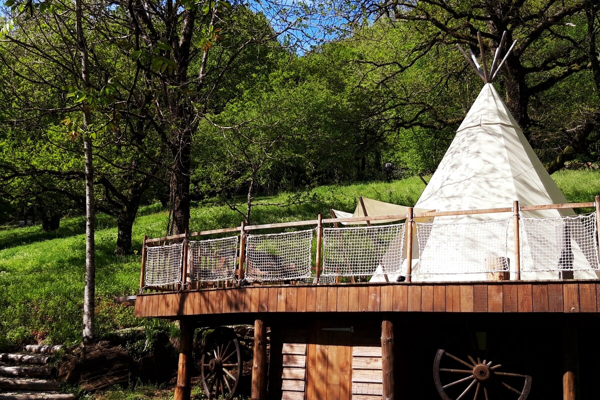 특이한 숙소, 어드벤처가 시작되는 곳입니다. 아메리카 원주민 캠프의 분위기에 흠뻑 빠져보세요. 서부 정복의 모험이 여러분의 발 아래에 있습니다. 140cm 너비의 침대 3개와 전용 건식 화장실로 구성된 6인용 목조 티피(전기 포함)로 더 편안한 숙박을 즐기세요. 예약 메시지에서 요청하는 '도착 시 침대' 옵션뿐만 아니라 일회용 시트를 예약할 수 있습니다.