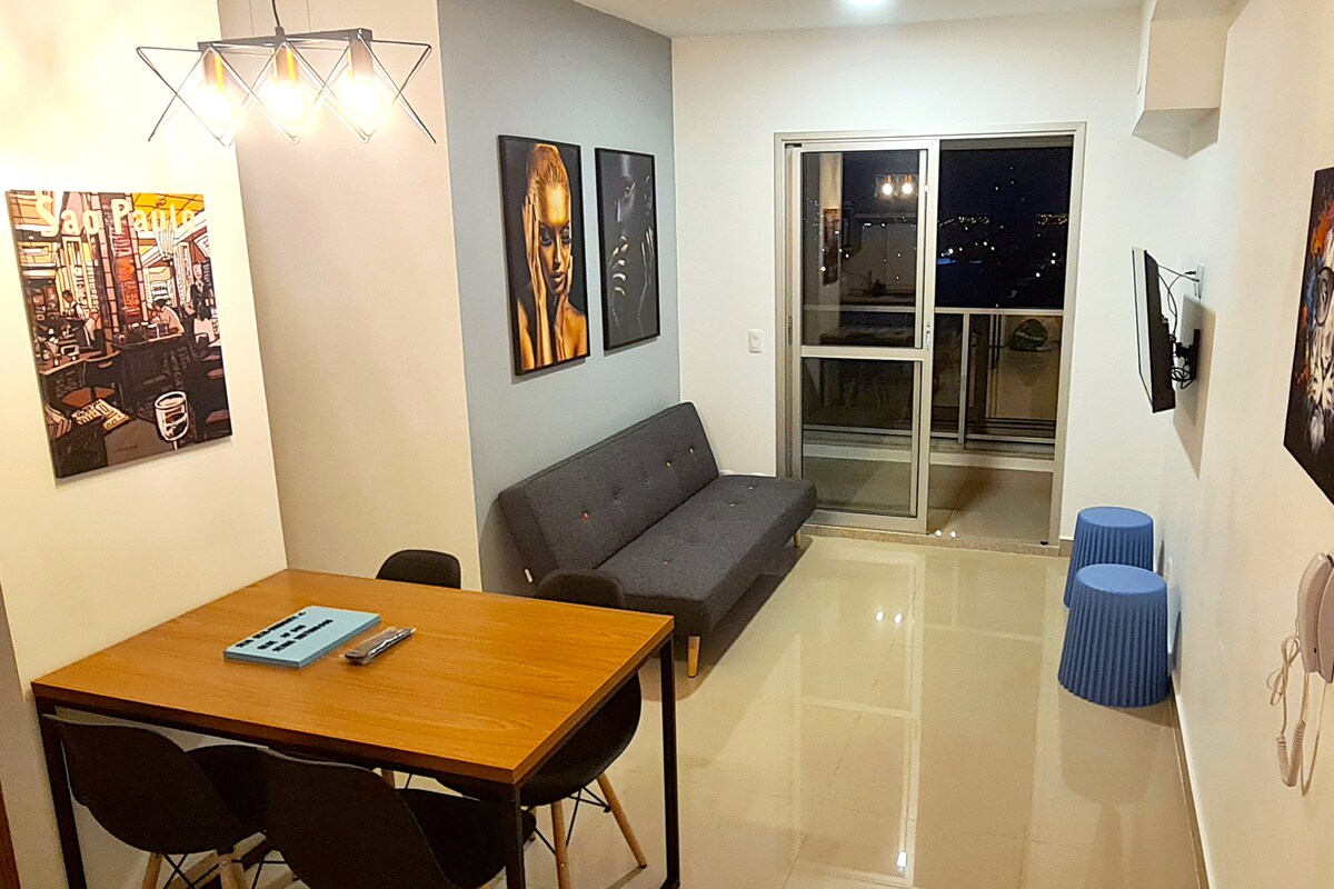 Comfort and style at your next destination! 🌟 🛏️ Accommodates up to 3 guests: double bed and sofa bed. ❄️ Air conditioning. 🍳 Fully equipped kitchen: fridge, stovetop, microwave, sandwich maker, and utensils. 🛁 Modern and spotless bathroom. 🛌 Bed and bath linens included. 🏊♂️ Pool, 🏋️♀️ gym, 🧖♀️ sauna, and 🎮 game room. 🛒 Mini market in the building with essential items. 🧺 Laundry available (paid and by appointment). Planned furniture and strategic location. Book now! ✨