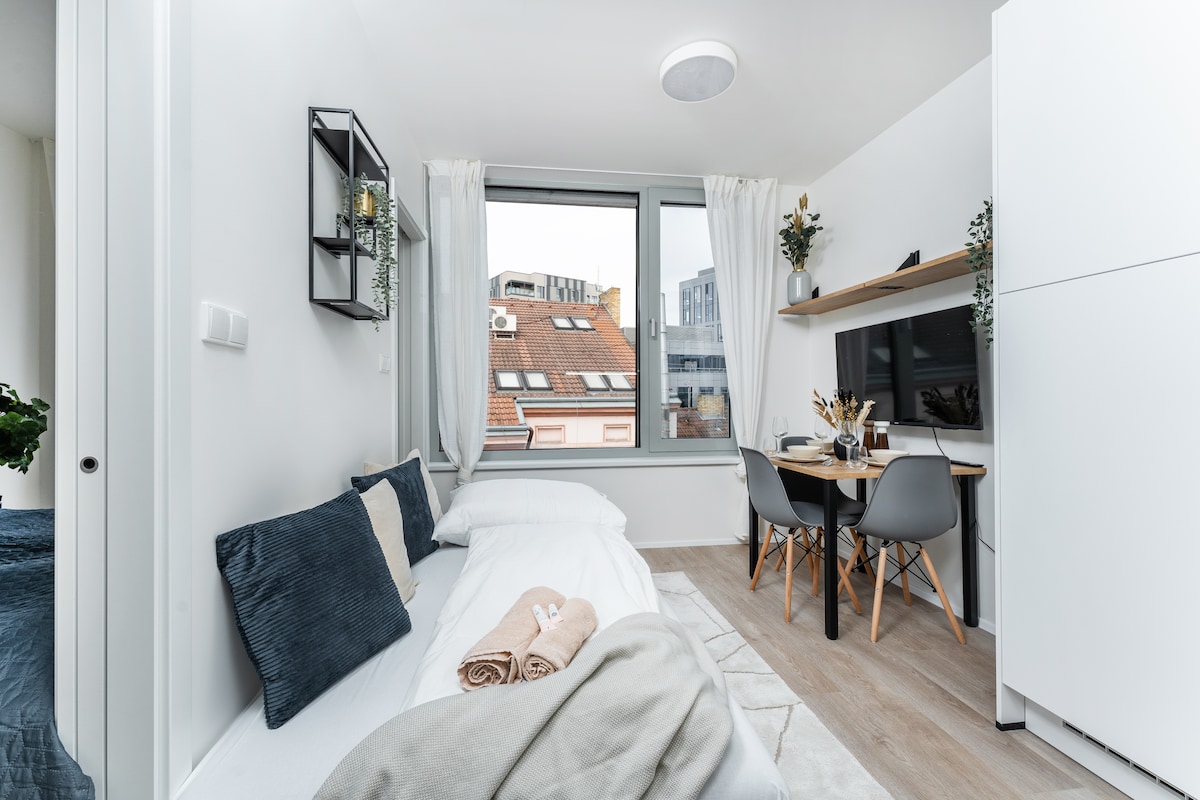 ⚡️ Reach Old Town in 10 min for €1.5 ⚡️ WiFi - Ultra Fast 1Gbps ⚡️ A/C for a comfortable stay ___ • Built-in 2023, modern 20m² studio • Bed pulls out from wardrobe, covers sofa • Paid parking via “Mr. Parkit” in building across • SMART TV w/Netflix, O2TV • Fully equipped kitchen + Washer • Near shops, cafes, nightlife • “Novy Smichov” mall 5min walk • Workspace for remote work • Nespresso coffee and tea • Metro “Anděl” & Tram 5min walk • 25 min walk to City Center • Electric exterior shutters