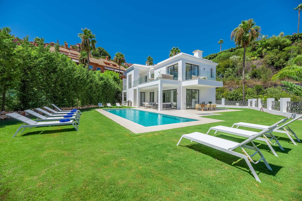 Villa Monte Halcones: Managed by Vacation Marbella, the largest holiday rentals in Marbella. Built in 2.023 A WORLD OF LUXURY IN THIS BRAND-NEW VILLA NEXT TO THE GOLF VALLEY WITH PRIVATE POOL & BREATHTAKING VIEWS. • Very attractive location • Add us to your wishlist by clicking the ❤ in the upper-right corner. • Panoramic Sea views • BBQ • Close to Puerto Banus and Restaurants • Lush Garden area with Terraces • Bililard, Arcade Video Games and Cinema Room • Very Fast Wi-Fi - 300mb