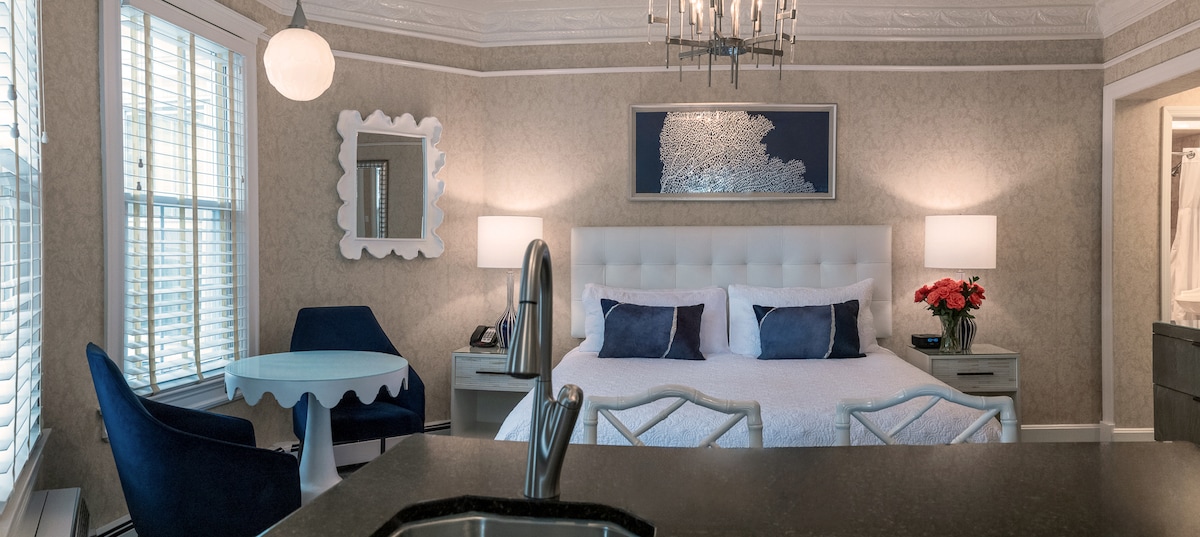 Our Kitchenette King Room is ideal for up to two guests. This accommodation is located in our Chateau Villa and features a fully equipped kitchen as well as a private porch with outside dining. Seven-night minimum stay required.