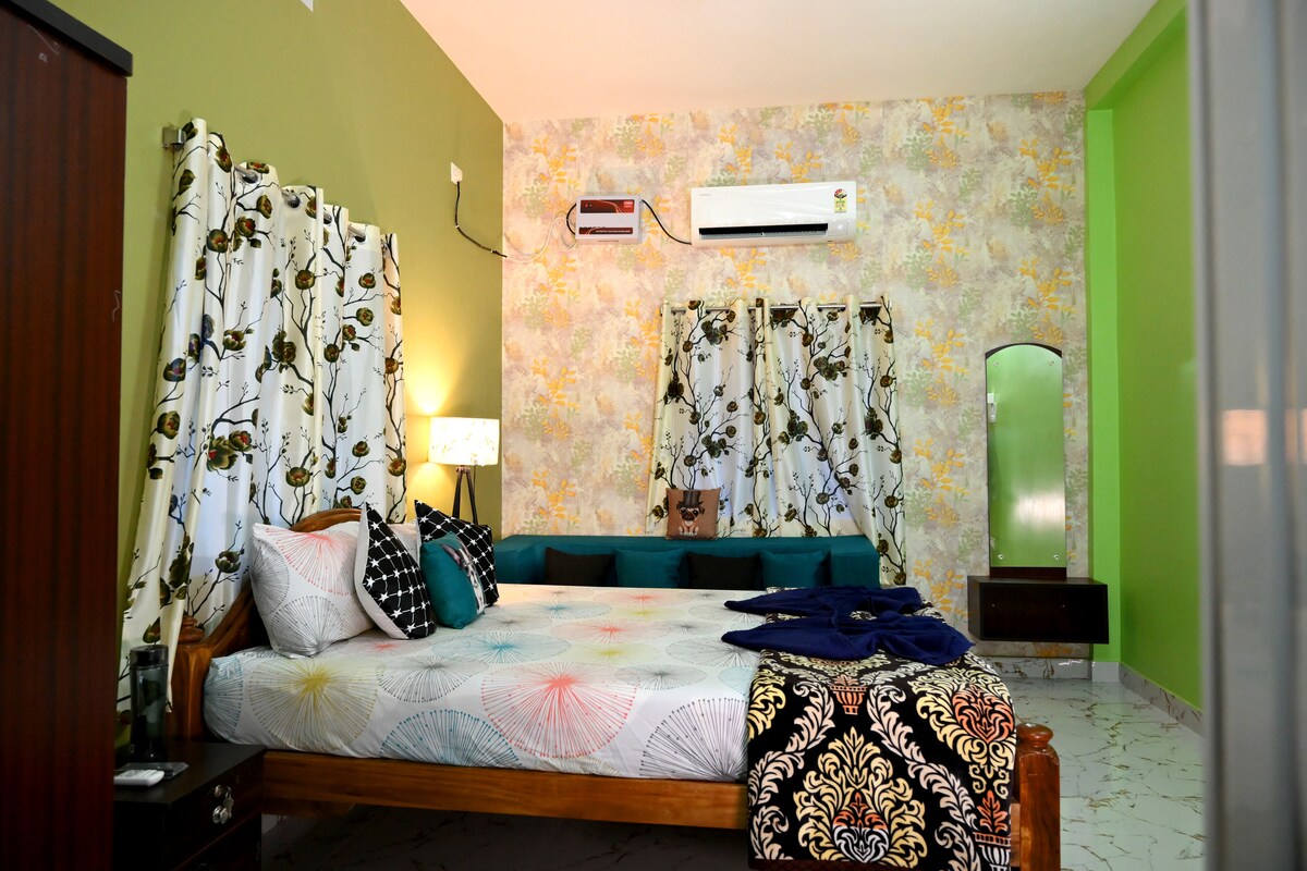 침실 2개와 전용 욕실 1개 및 공용 욕실 1개가 있는 1.5 베드룸 주택입니다. 중요한 알림: 2bhk 숙소이며, 게스트 수에 따라 가격을 달리합니다. 게스트 2명: 기본 요금(X) 게스트 3명: X + 추가 게스트 1명 게스트 2명의 경우, 마스터 침실, 거실, 주방, 욕실을 이용할 수 있습니다. 하지만 게스트 침실은 잠겨 있습니다. 3명 이상의 게스트: 침실이 모두 잠금 해제된 2bhk 전체를 이용하실 수 있습니다. 커플이나 소규모 가족이 2BHK를 저렴하게 이용할 수 있도록 하기 위해 마련되었습니다.