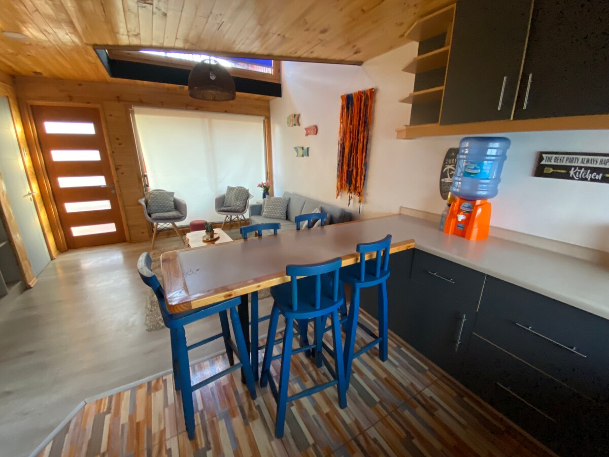 자연 속에서 휴식을 취하고자 하는 커플이나 여행객에게 이상적인 아늑한 캐빈 스타일의 로프트에서 푼타데로보스의 평온함을 즐겨보세요. 침실, 시설이 완비된 주방, 전용 욕실이 통합된 개방적인 분위기의 숙소입니다. 테라스에서 아름다운 바다 전망과 이 지역의 특징인 넓고 조용한 환경을 즐기실 수 있습니다. 해변에서 불과 몇 분 거리에 있어 피칠레무의 정수를 경험하고 휴식을 취하기에 완벽합니다.
