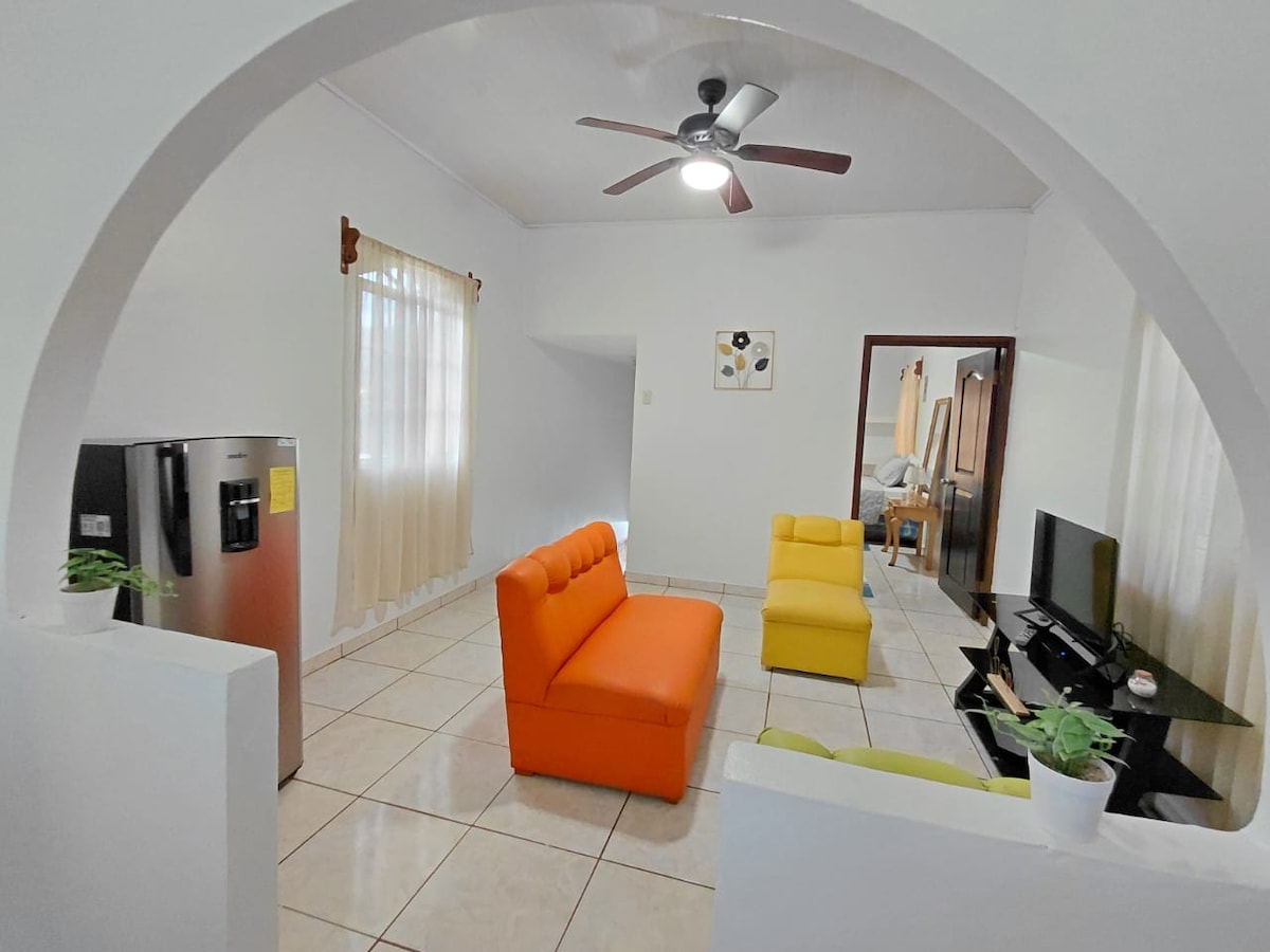 Hermoso apartamento céntrico, tranquilo y muy seguro, ubicado estratégicamente cerca de supermercados, restaurantes, bancos, tiendas, parques, clinicas, farmacias etc. •Espacio seguro y privado •Cocina completa con todo lo necesario para preparar tus alimentos •Sala acogedora •Sofá grande •Comedor para tres •Un baño completo •Un dormitorio cama Queen •Aire acondicionado •TV con cable •Lavaderia •Area de estacionamiento •Balcón privado •WiFi •Area social