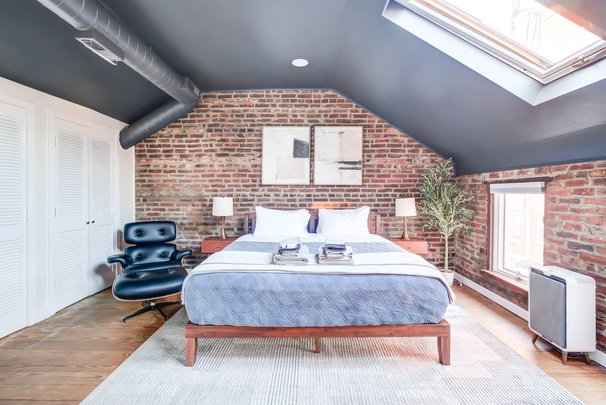 창고를 예술적으로 개조한 이곳에서 나무 화덕을 피우고 따뜻함을 즐기거나, 라벤더가 늘어선 파티오에서 야외 커피를 마시세요. 노출된 벽돌 벽과 표백된 목재 대들보는 1818년 빈티지를 떠올리게 합니다. 고급 가구, 디자이너 조명 기구, 새로 단장한 주방이 현대적인 고급스러움을 선사합니다. * 게스트의 편안함과 안전이 저희의 최우선 순위입니다. 엄격한 청소 수칙 외에도 게스트는 타운하우스 전체와 거리 수준의 전용 출입구를 독점적으로 이용할 수 있습니다.
