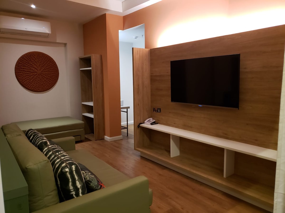 Thermas dos Laranjais 근처의 Olímpia Park Resort의 침실 1개가 있는 Apto. 더블 소파 베드가 있는 거실 1개, 전자레인지와 미니바가 있는 미국식 주방(스토브, 냄비, 접시, 식기류 등 없음), 샤워기가 있는 욕실, 더블 침대 1개와 싱글 침대 1개가 있는 침실, 5인용 침구와 수건, 헤어드라이어, 와이파이, 침실과 거실에 에어컨, 지붕이 있는 주차장, 공원으로 쉽게 이동할 수 있습니다. 220볼트 콘센트.